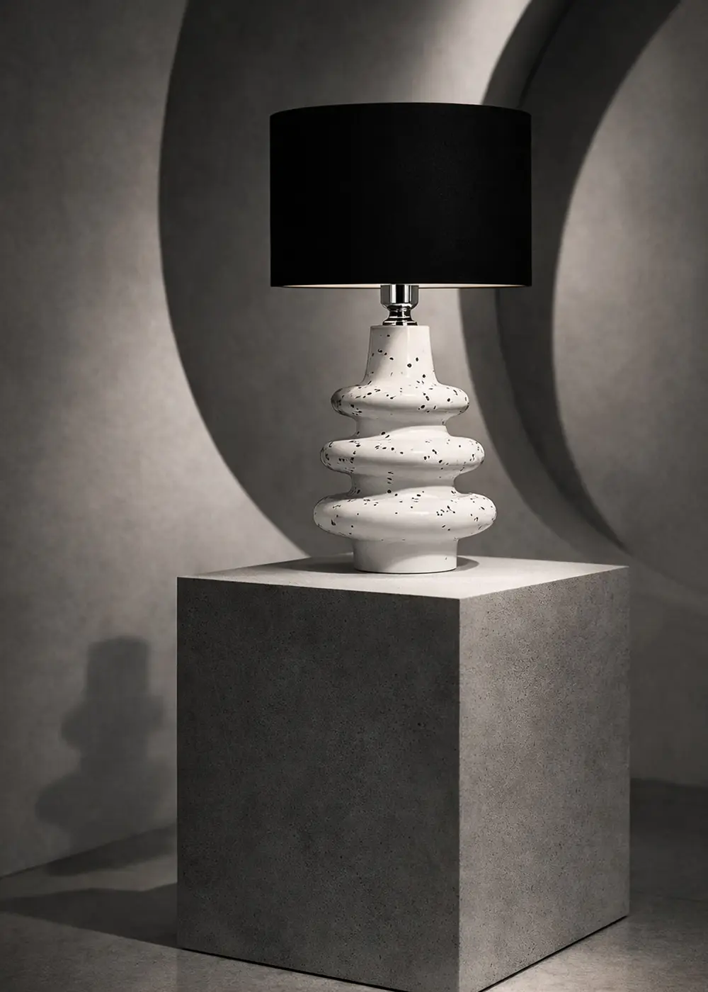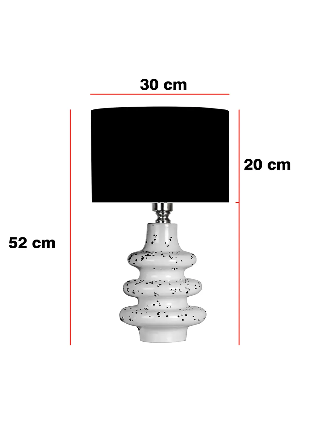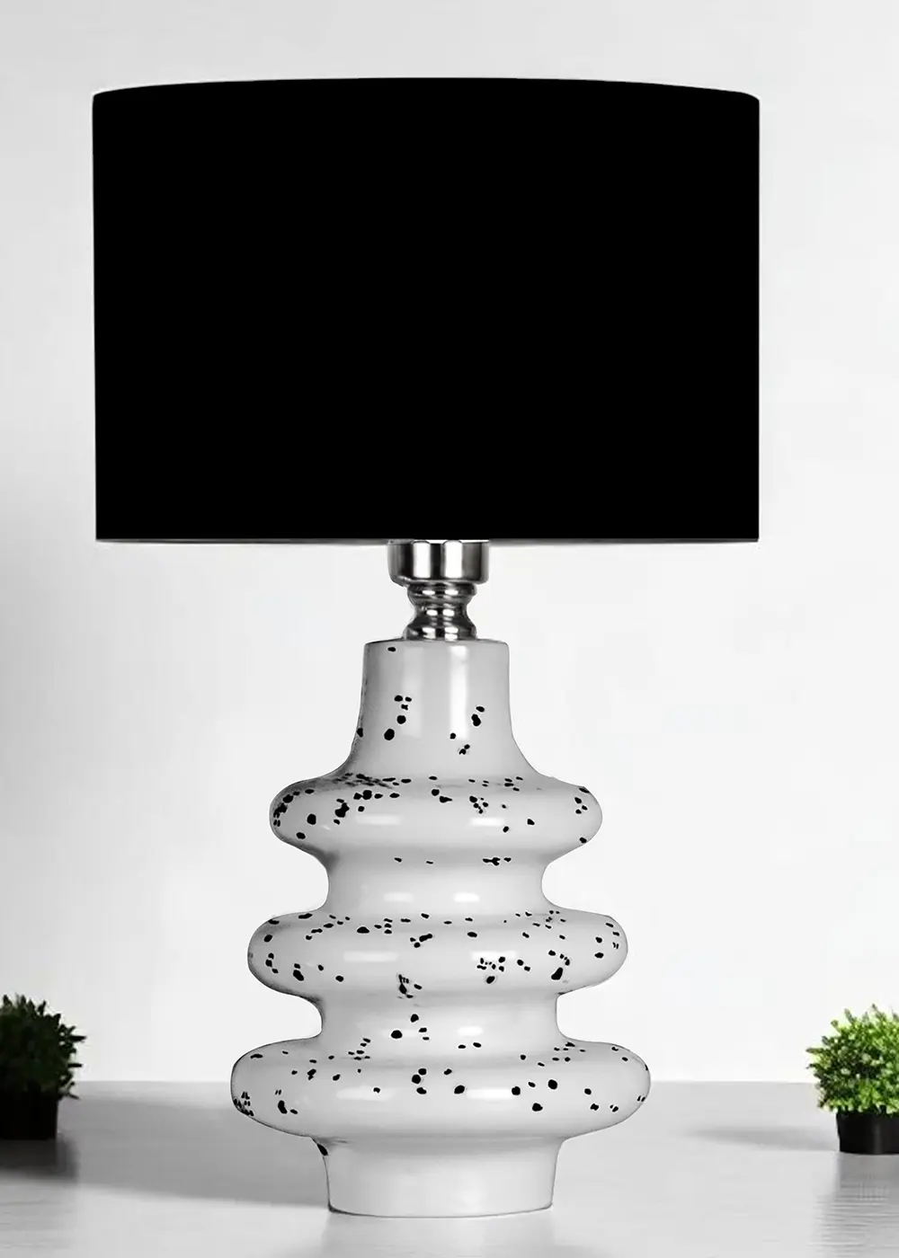 Bu modern seramik abajur, katmanlı beyaz gövde formu ve siyah sıçrama desenleriyle sıradan bir masa lambasından çok daha fazlasını sunar. Heykelsi silueti sayesinde bulunduğu mekânda yalnızca bir aydınlatma ürünü değil, aynı zamanda dikkat çekici bir tasarım objesi olarak konumlanır.