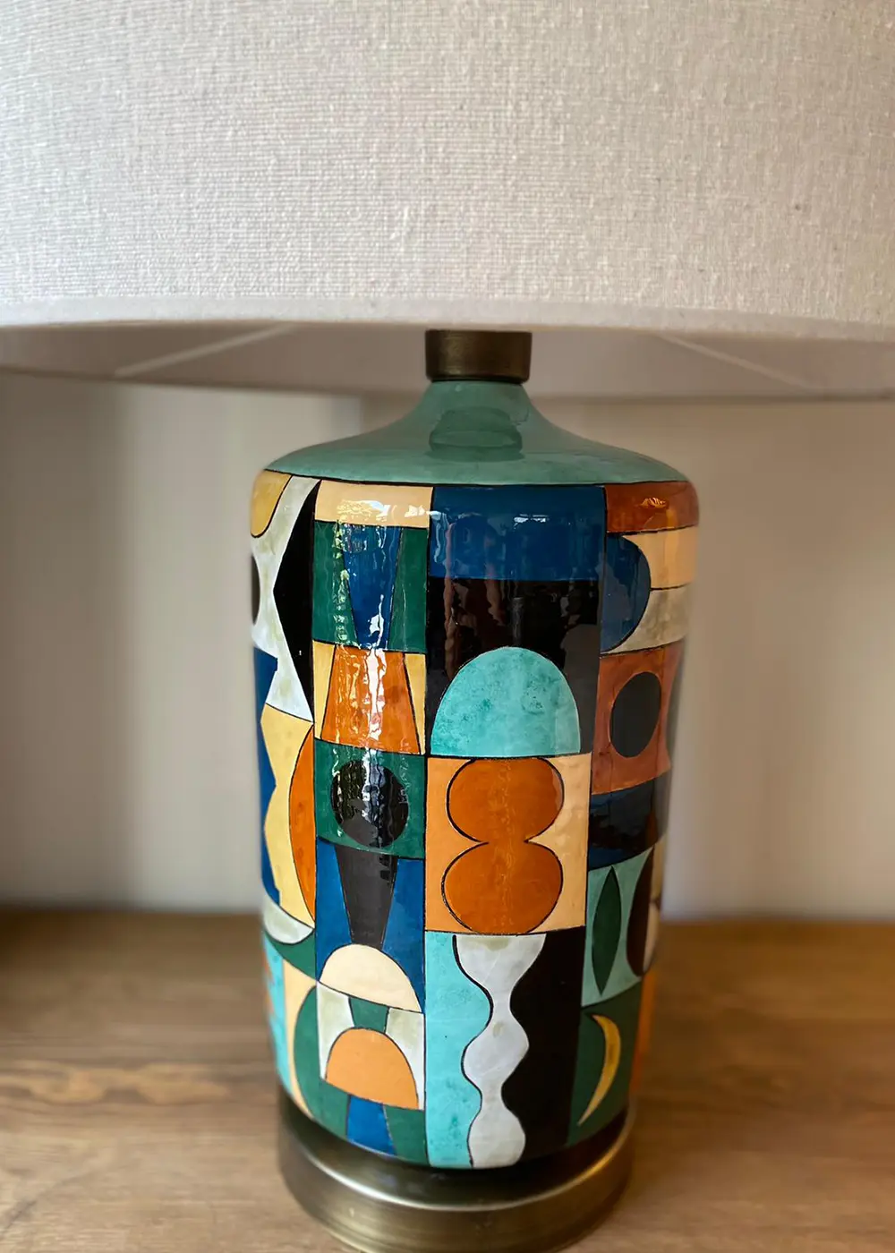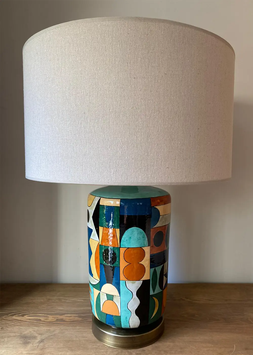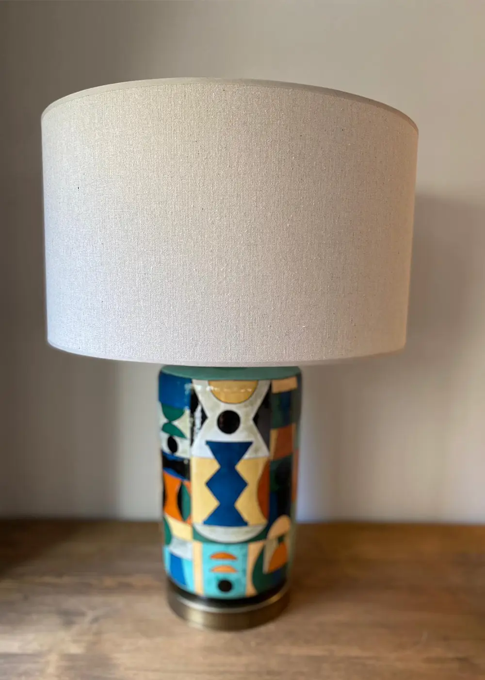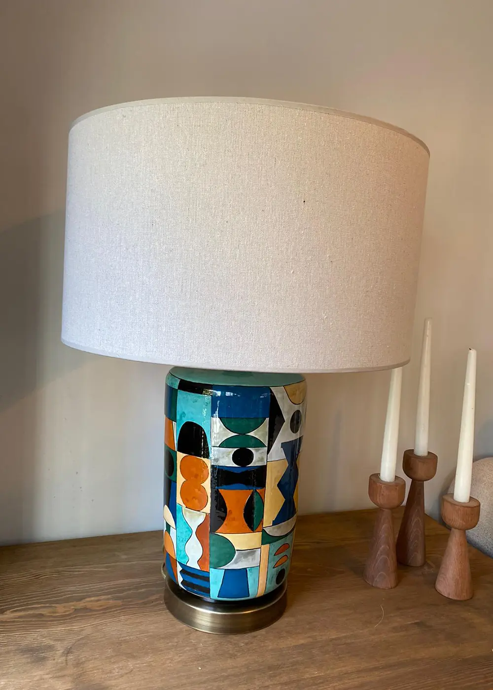 Renk, form ve ritmin güçlü bir birleşimi: Auguste Abajur – Mavi, bulunduğu mekânda anında dikkat çeken, karakter sahibi bir aydınlatma ürünü. El yapımı seramik gövdesi üzerindeki modern ve soyut desenler, sanatsal bir kompozisyon hissi yaratırken; dengeli formu ve geniş şapkası ile mekâna yumuşak ve homojen bir ışık yayar.