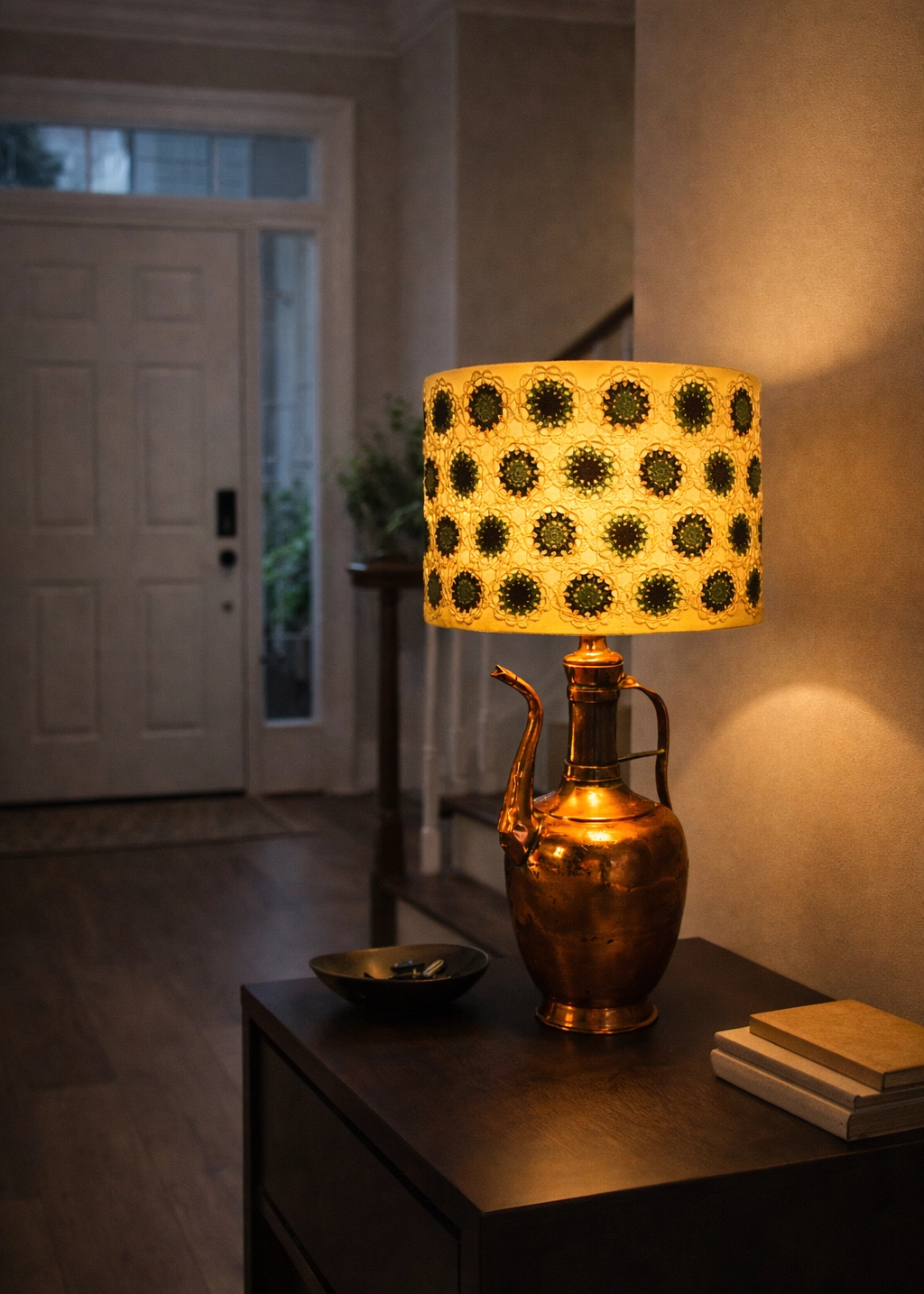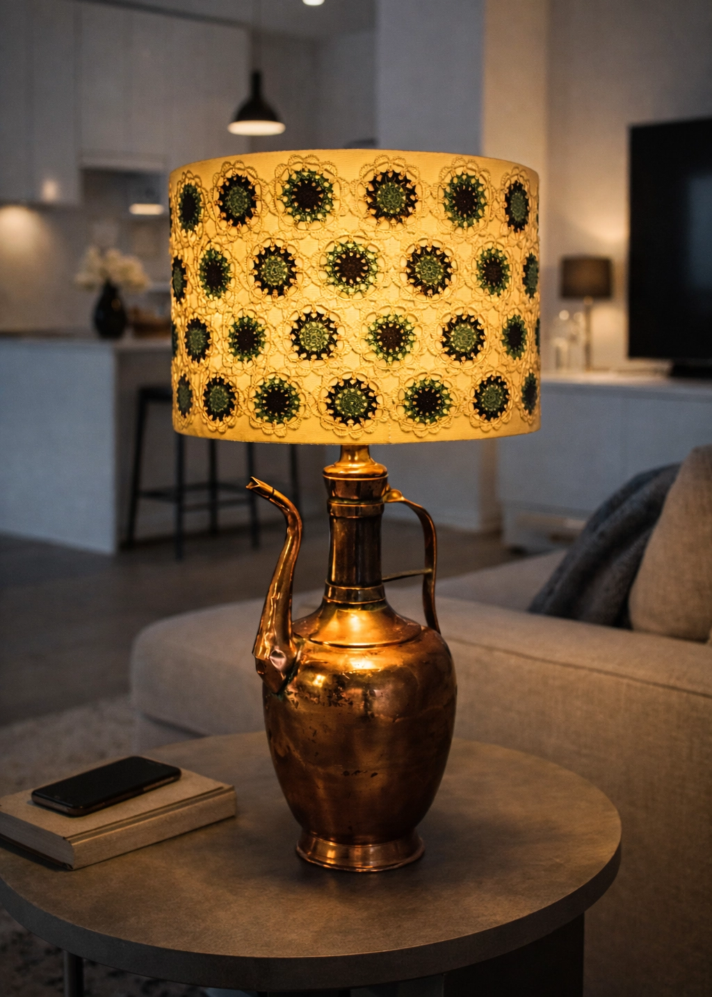 Bu abajur, geçmişte bakır bir ibrik olarak kullanılmış ve hikâyesi olan bir objenin yeniden hayat bulmuş hâlidir. Antika dokusu, el işçiliğiyle buluşur ve ışıkla birlikte yeni bir anlam kazanır. Artık sadece görülen değil, hissedilen bir parçaya dönüşür.