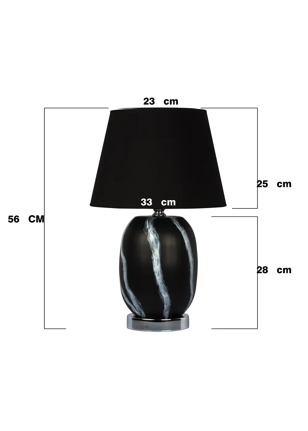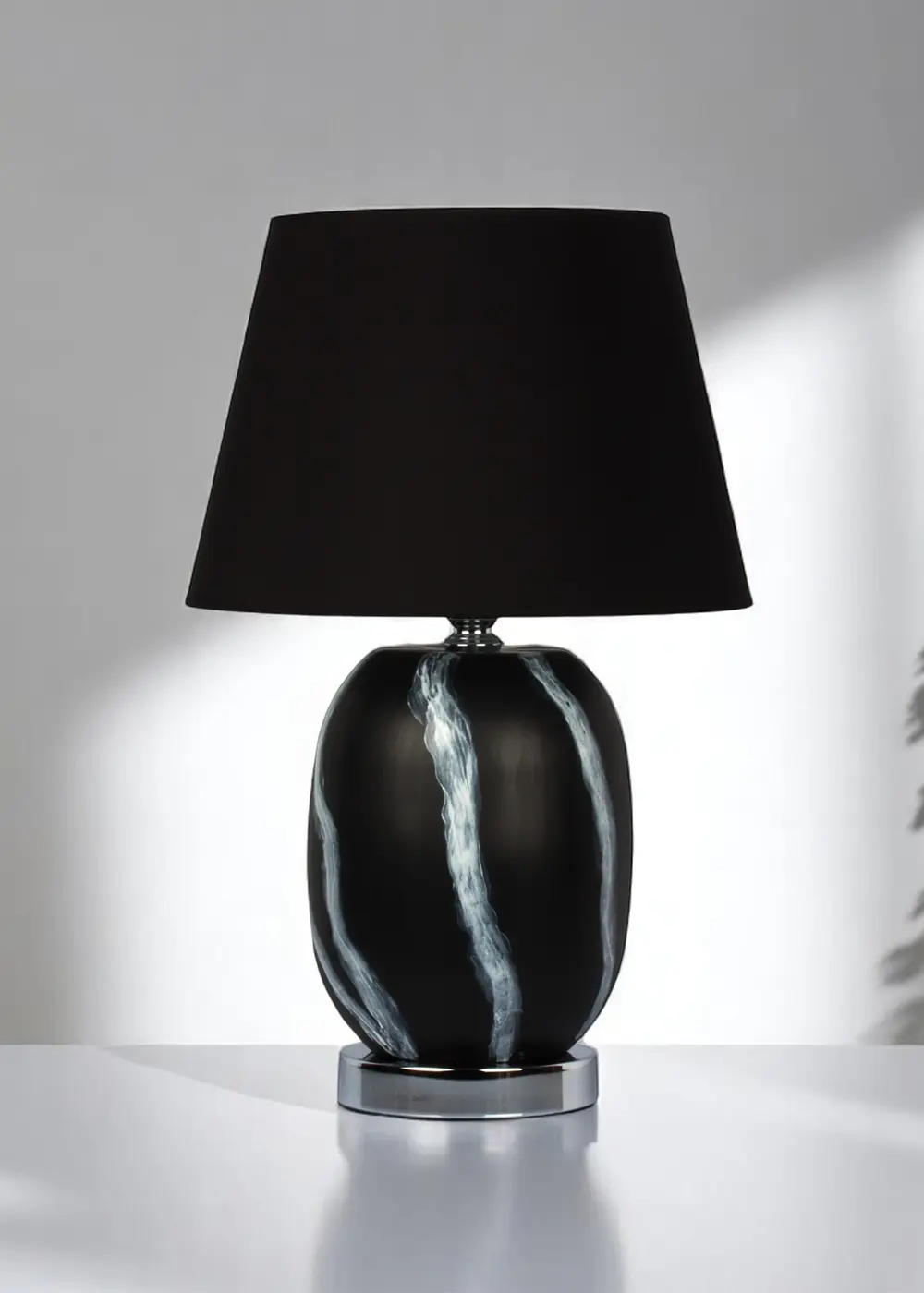 Siyah şapkalı versiyon, bu el boyama seramik abajurun daha iddialı ve sofistike yüzünü ortaya çıkarır. Siyah sırlı seramik gövde üzerine uygulanan beyaz el boyama fırça desenleri, yüzeyde derinlik ve ritim yaratırken; siyah kumaş şapka tasarıma güçlü bir bütünlük kazandırır. Krom kaplama metal taban ise modern ve temiz bir bitiş sağlayarak ürünü premium bir çizgiye taşır.
