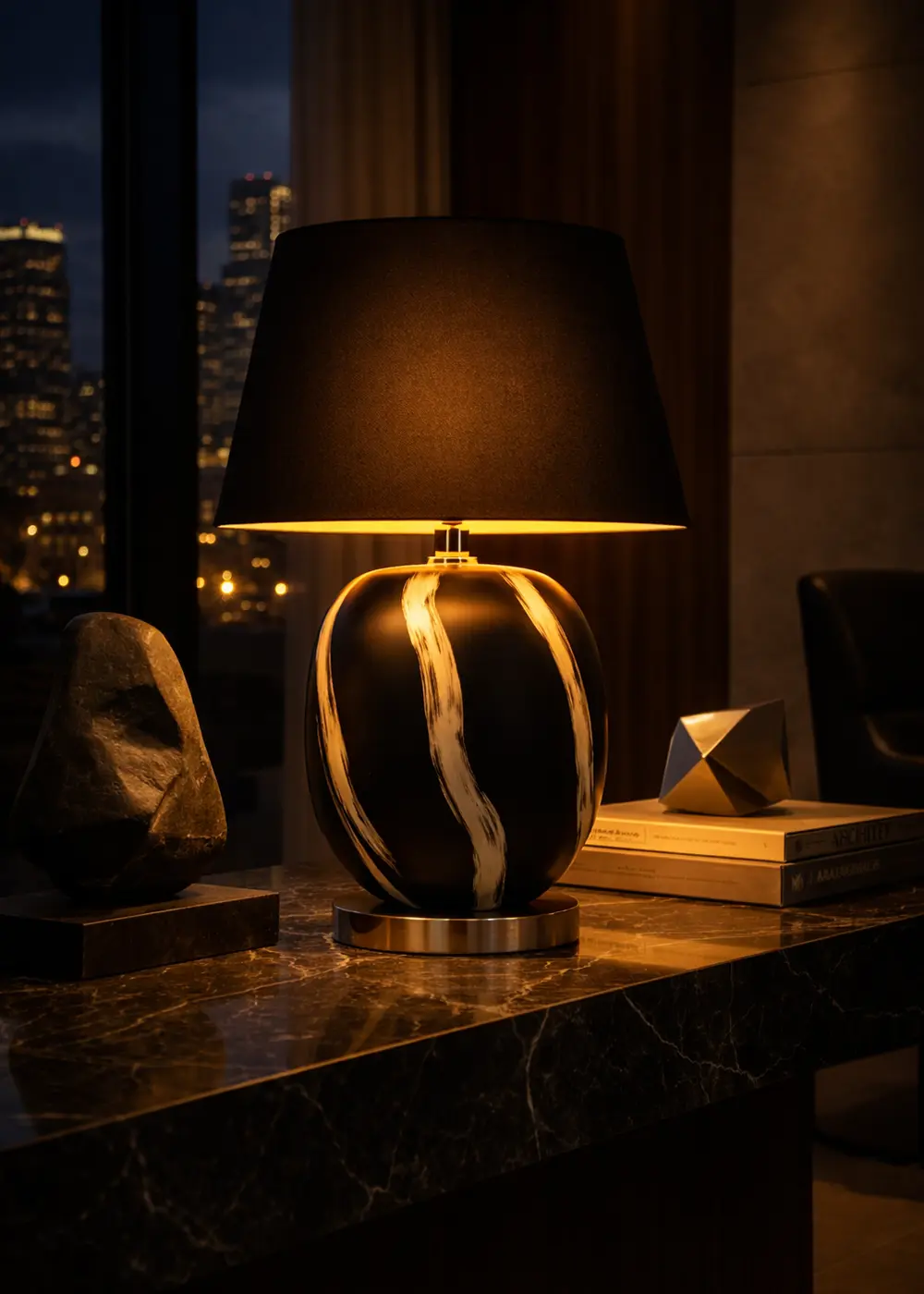 56 cm yüksekliği sayesinde komodin, konsol, yan sehpa veya çalışma masası üzerinde dengeli bir “heykel” duruşu sergiler. Siyah şapka, ışığı yumuşatırken aynı zamanda daha kontrollü bir ışık havuzu oluşturur; bu da akşam saatlerinde mekâna daha sinematik, daha mimari bir atmosfer kazandırır.