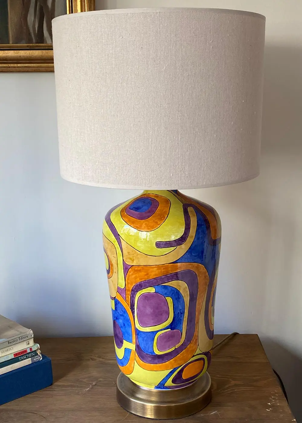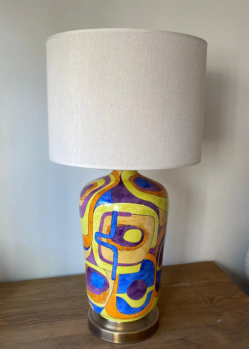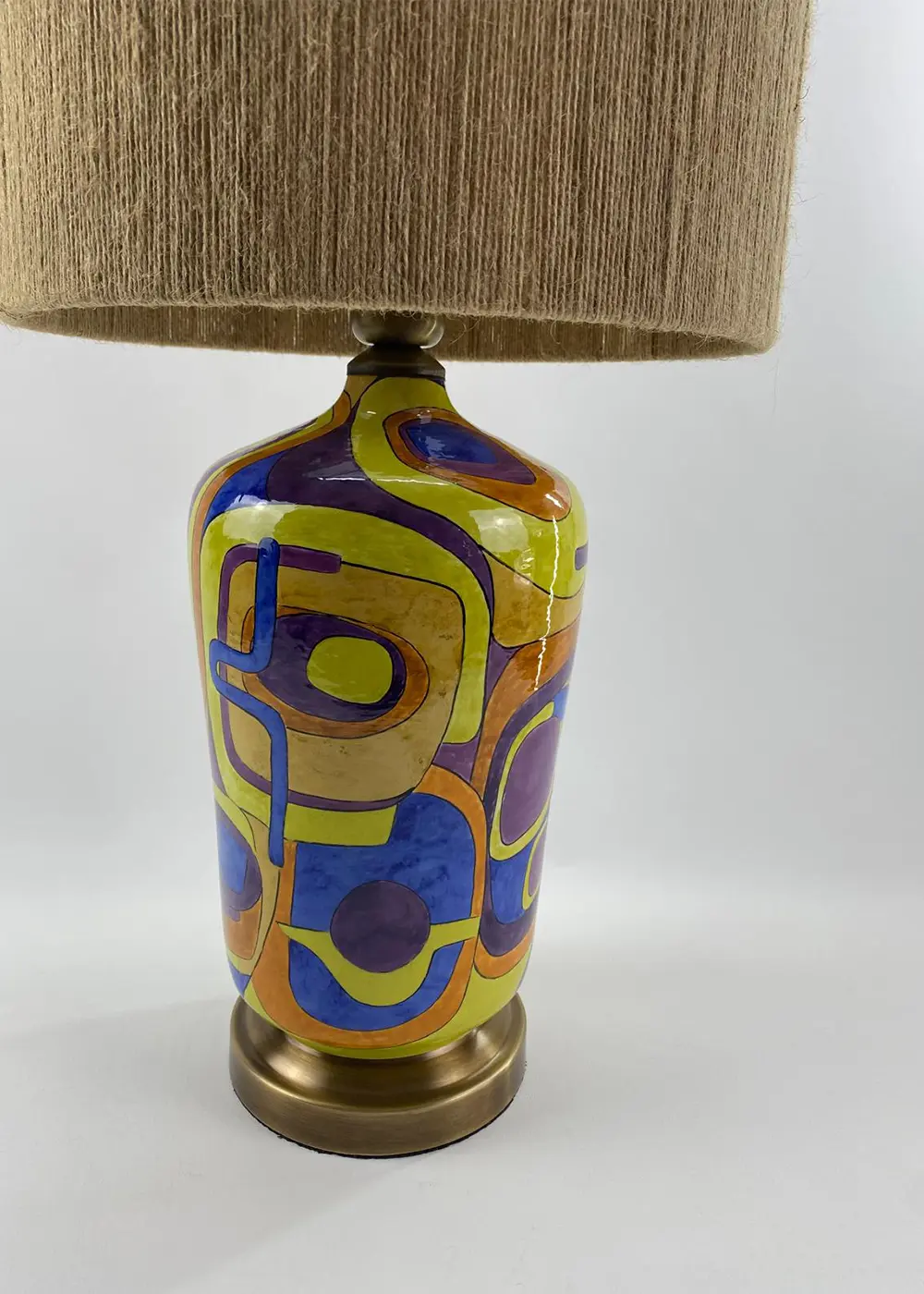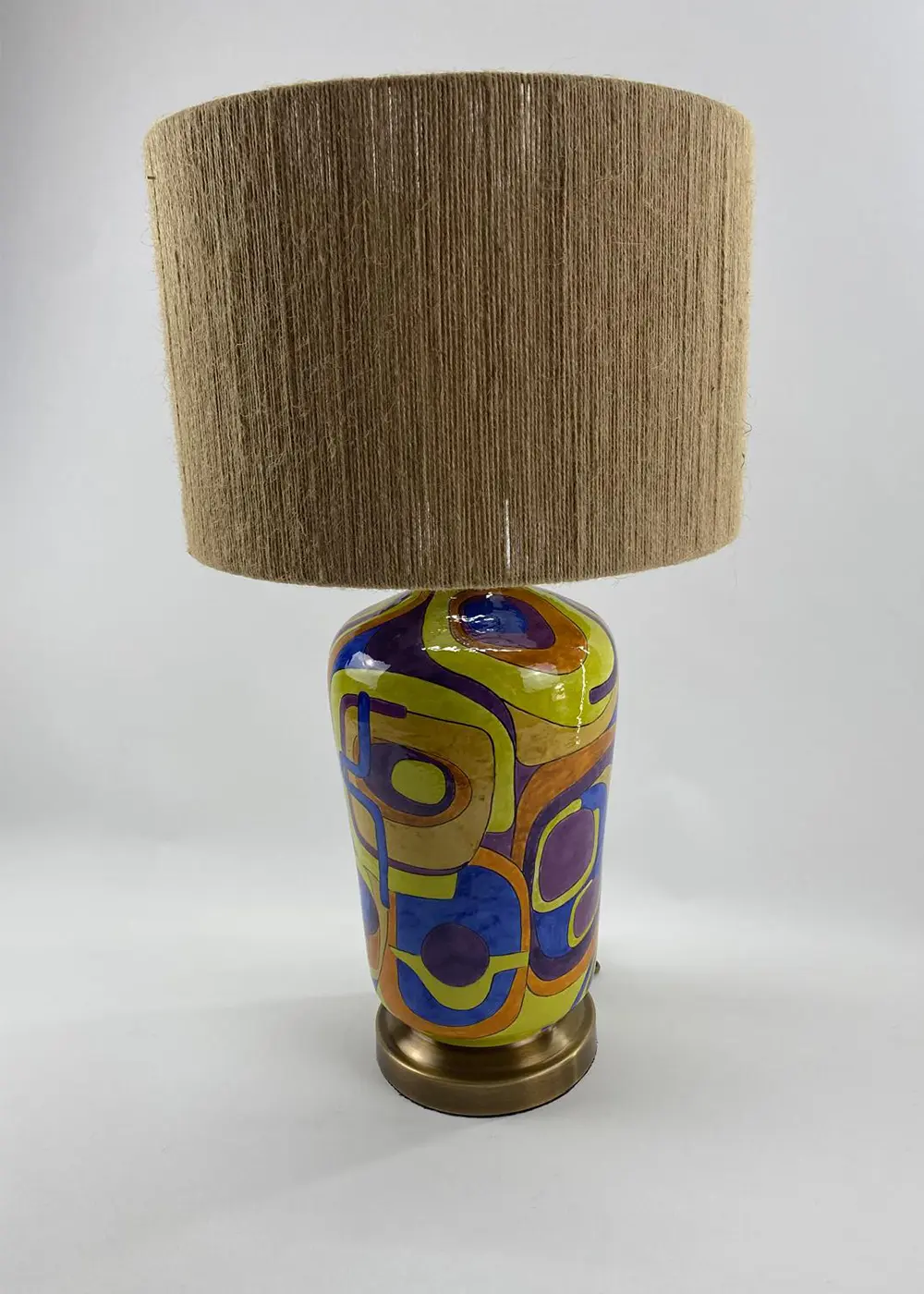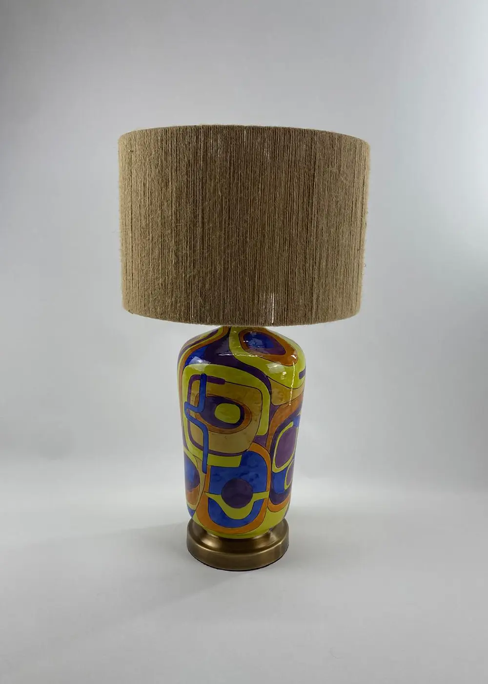 Canlı sarı, mor, mavi ve turuncu tonlarının dengeli birlikteliği, bu tasarım abajuru sıradan bir aydınlatma ürününün ötesine taşır. Geniş kumaş şapkası ise bu enerjik yapıyı yumuşatarak ortama sıcak ve dengeli bir ışık yayar.