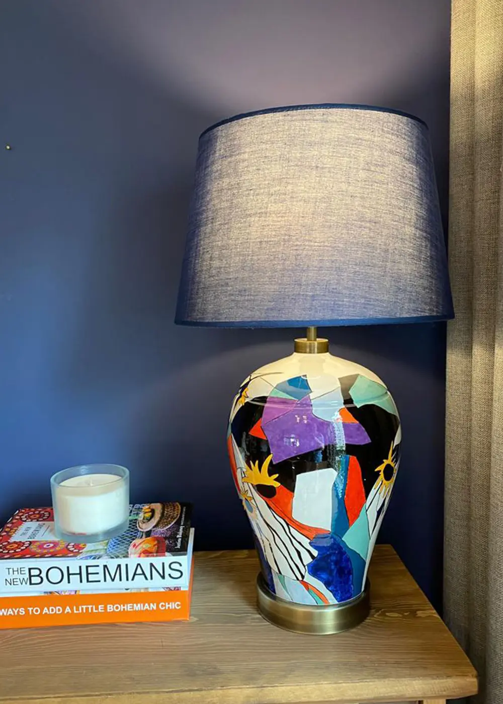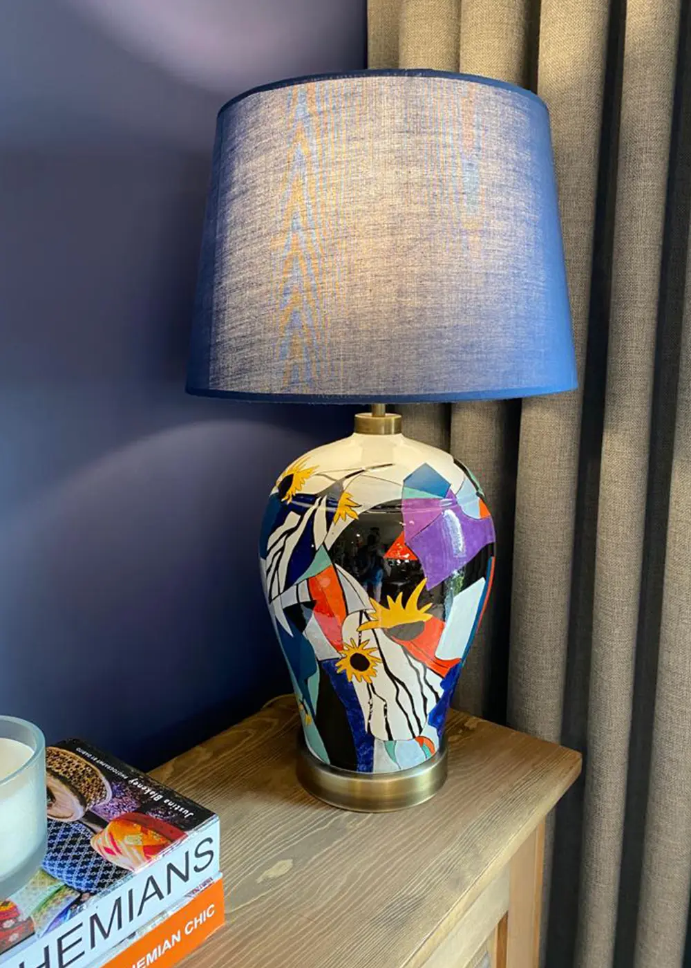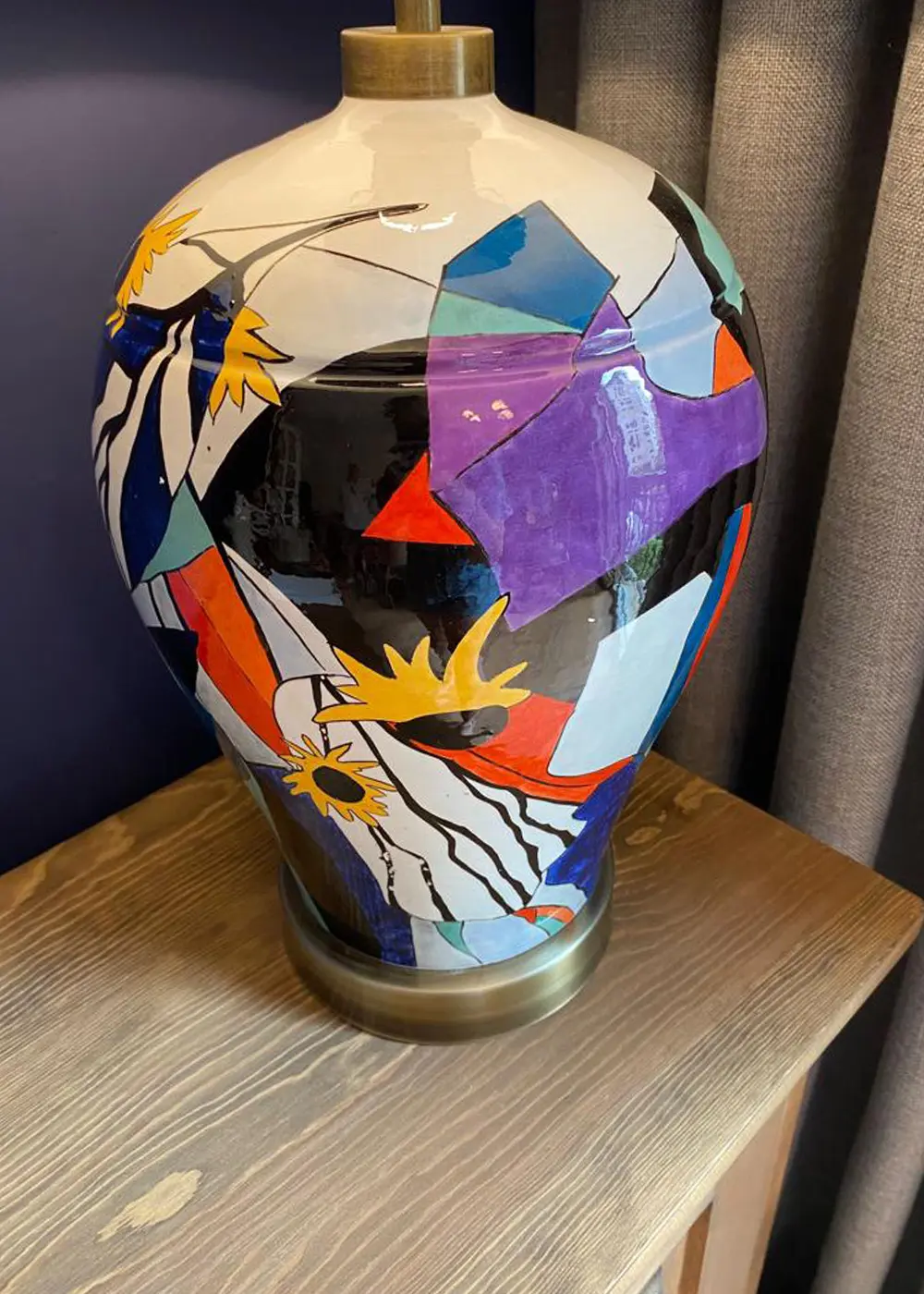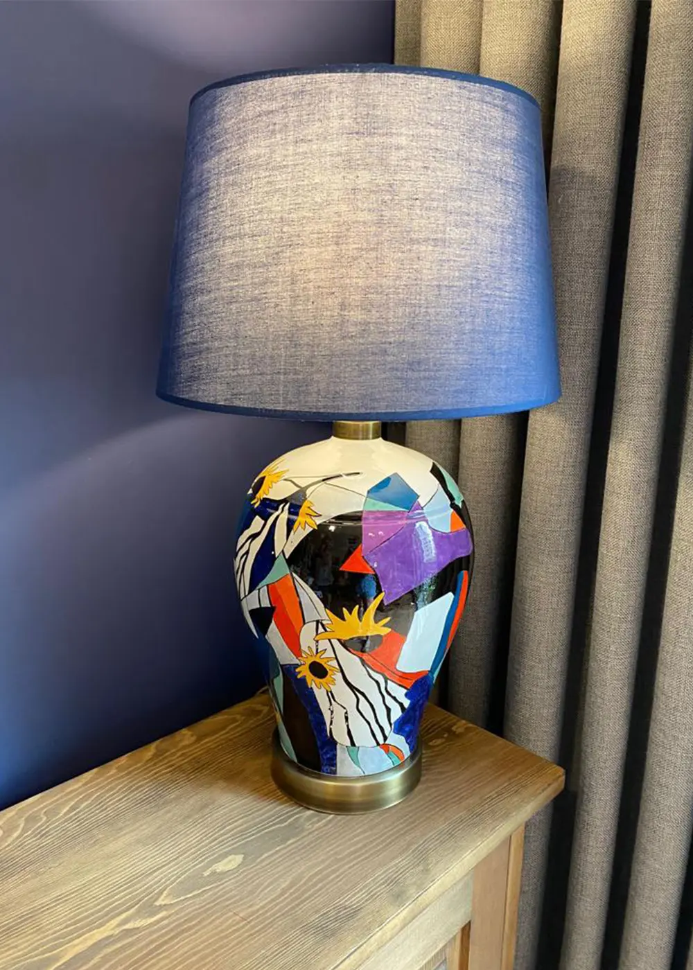 Soyut sanatın enerjisini yaşam alanlarına taşıyan Cynthia Abajur, renklerin ve formların özgür birlikteliğiyle dikkat çeken güçlü bir tasarım lamba. El yapımı seramik gövdesi üzerindeki katmanlı ve dinamik kompozisyon, her açıdan farklı bir görsel deneyim sunarak ürünü yalnızca bir aydınlatma ürünü değil, aynı zamanda sanatsal bir obje haline getirir.