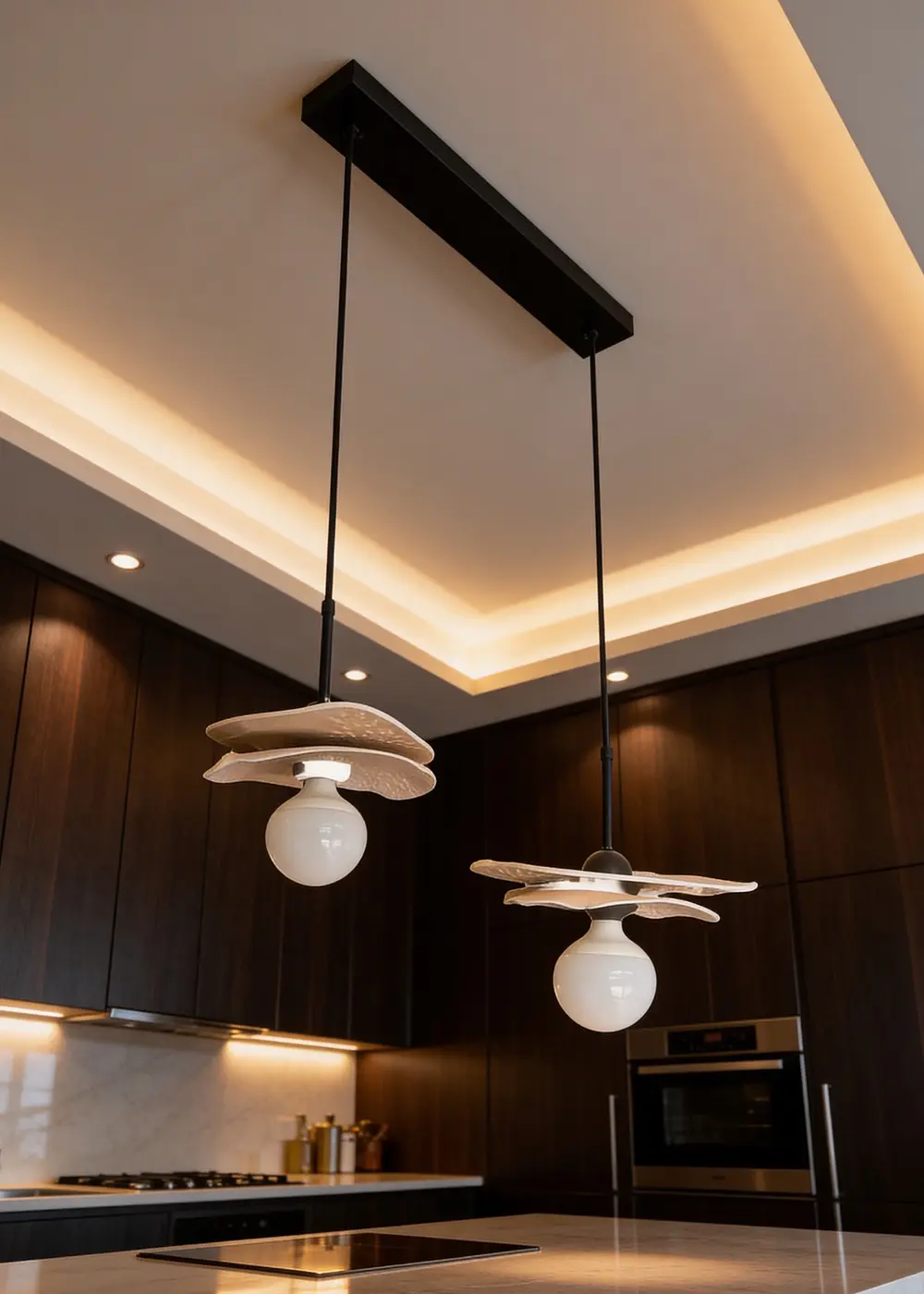 Bu tasarım sarkıt, özellikle yemek masası üzerinde, mutfak adasında ya da oturma alanlarında odak noktası oluşturmak için idealdir. Işığı yumuşak bir şekilde dağıtan yapısı sayesinde mekâna huzurlu ve dengeli bir ambiyans kazandırır.