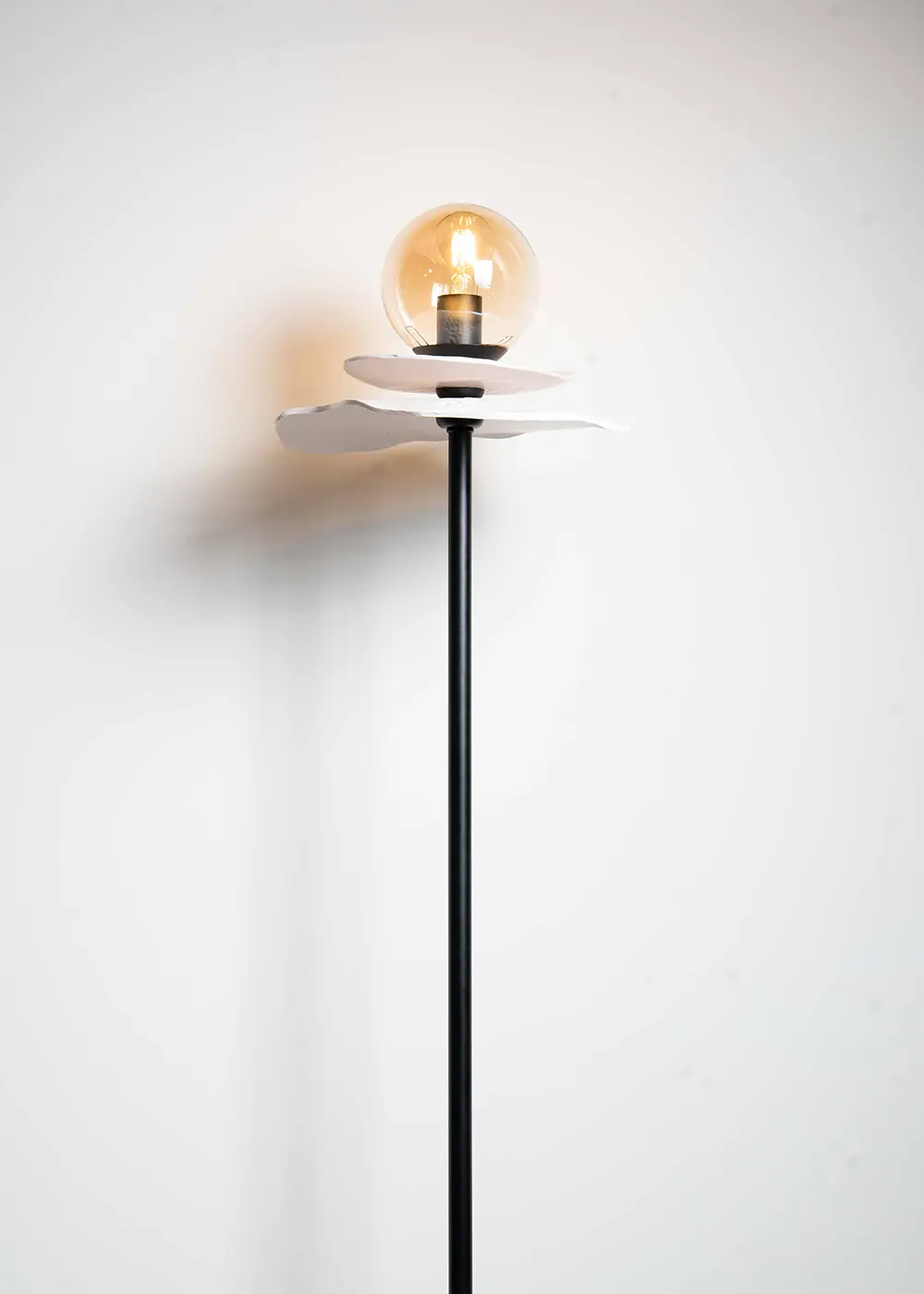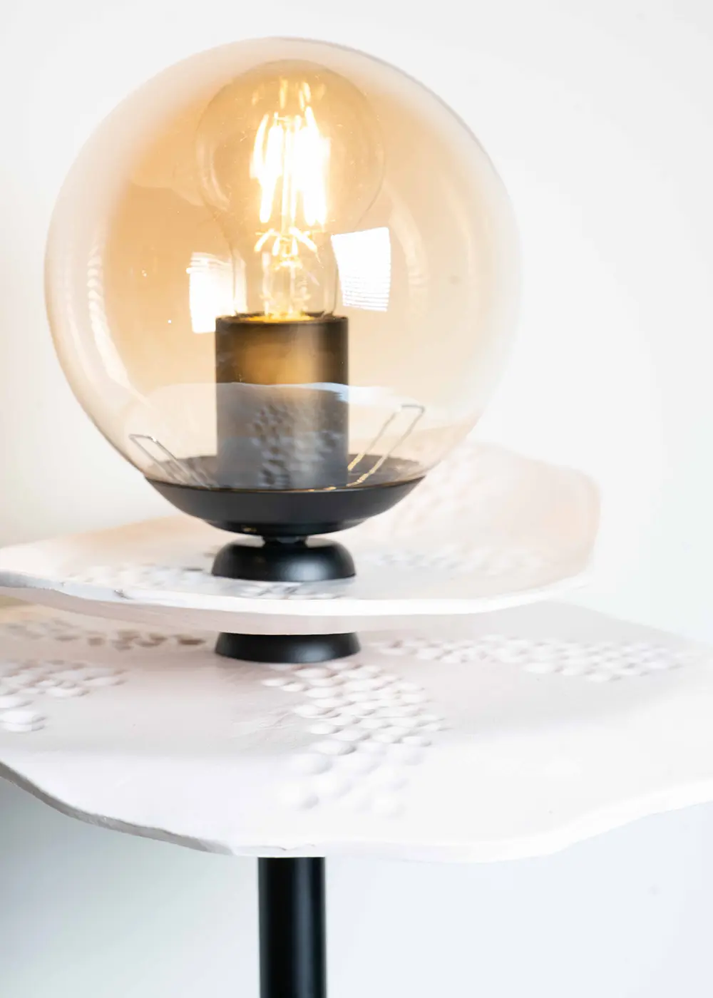 Mat siyah metal ayak üzerinde yükselen bu el yapımı lambader, sade ve güçlü tasarım dili sayesinde hem modern hem de zamansız iç mekânlara kolayca uyum sağlar. Seramik detayın doğal dokusu ve cam kürenin yumuşak ışığı, bulunduğu ortamda sakin ve estetik bir atmosfer oluşturur.