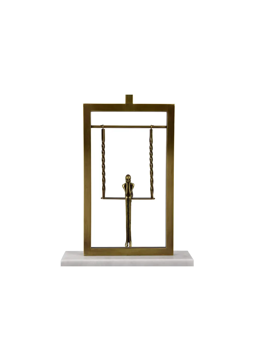 Mermer kaide, pirinç gövde ve tekstil başlık birleşimi sayesinde hem modern hem zamansız bir estetik ortaya çıkar. Figür detayı ise tasarımı yalnızca bir masa lambası olmaktan çıkararak dekoratif bir sanat objesi niteliğine taşır.