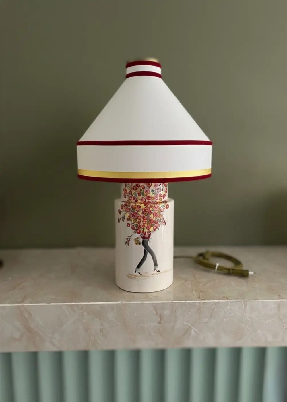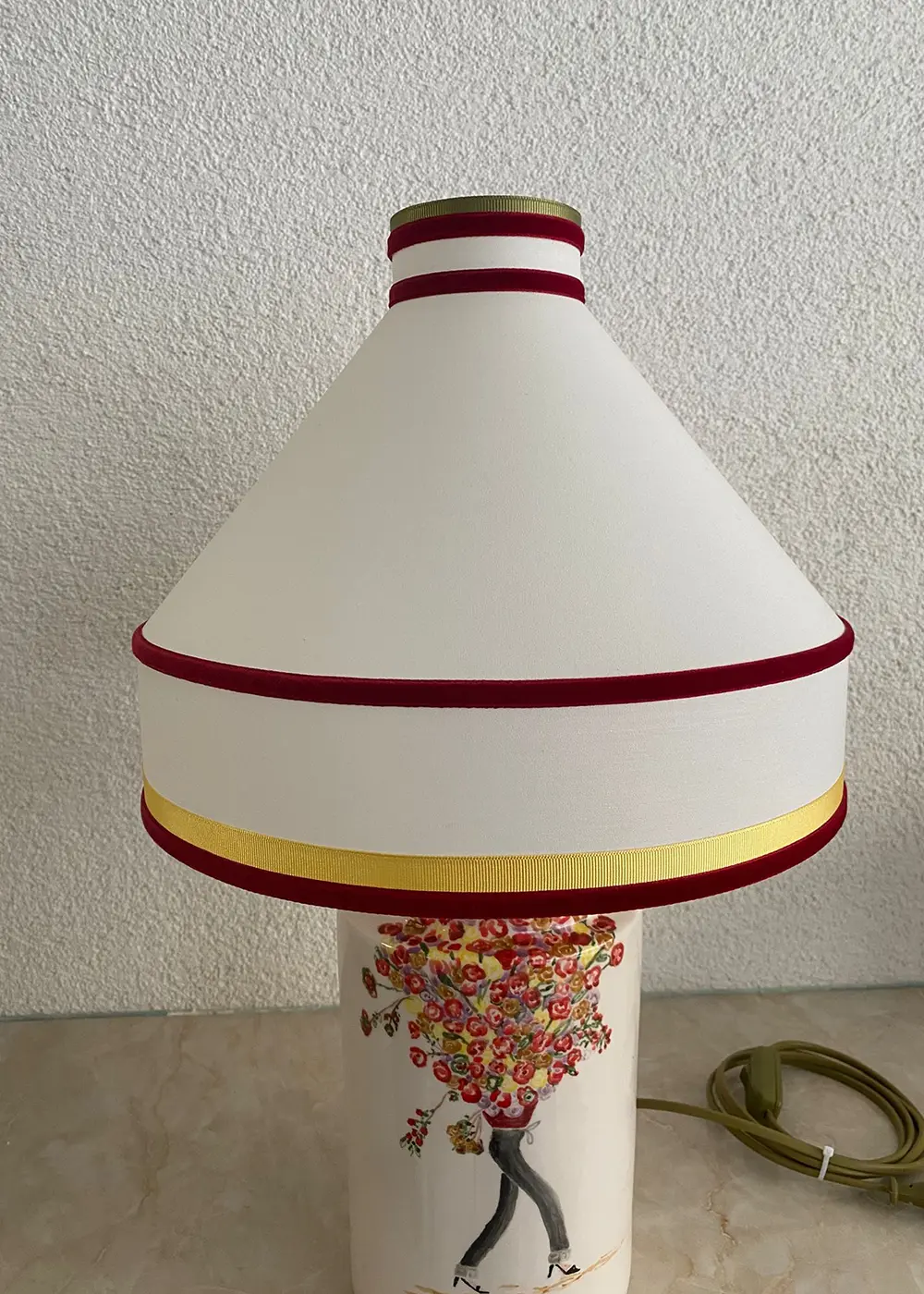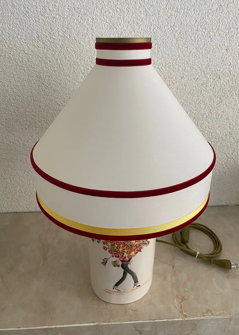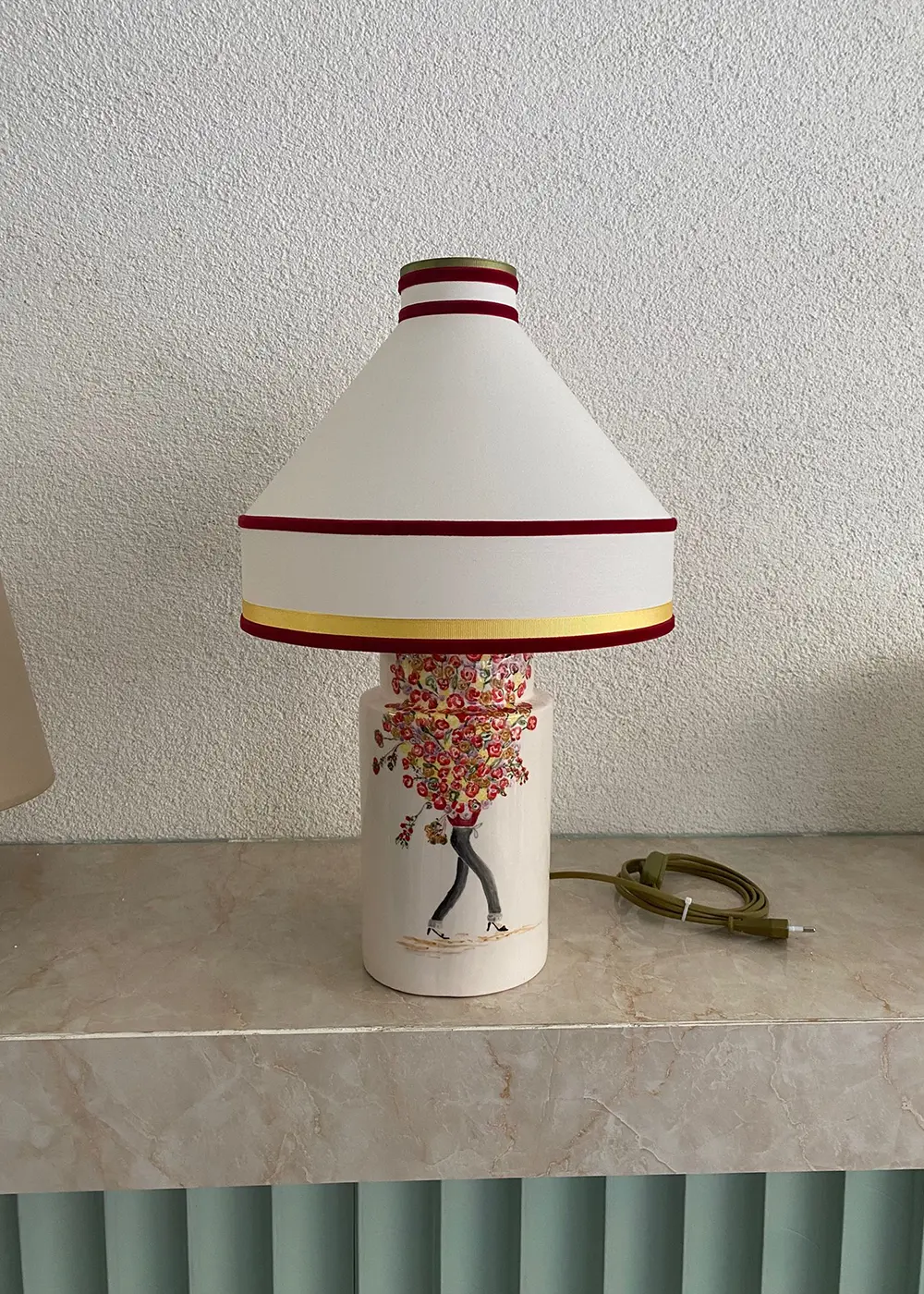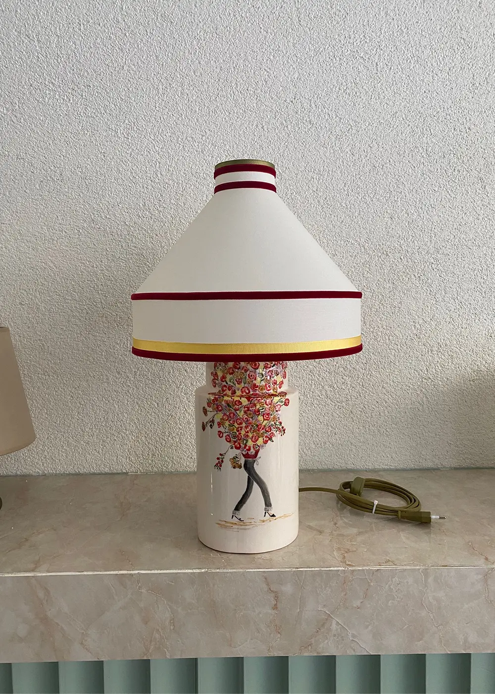 Gövdesinde yer alan detaylı illüstrasyon, her ürünün kendine özgü karakter taşımasını sağlar. El boyaması olduğu için hiçbir desen birebir tekrar etmez; her abajur tek ve özeldir. Bu yönüyle hem dekoratif masa lambası hem de sanatsal bir obje niteliğindedir.
