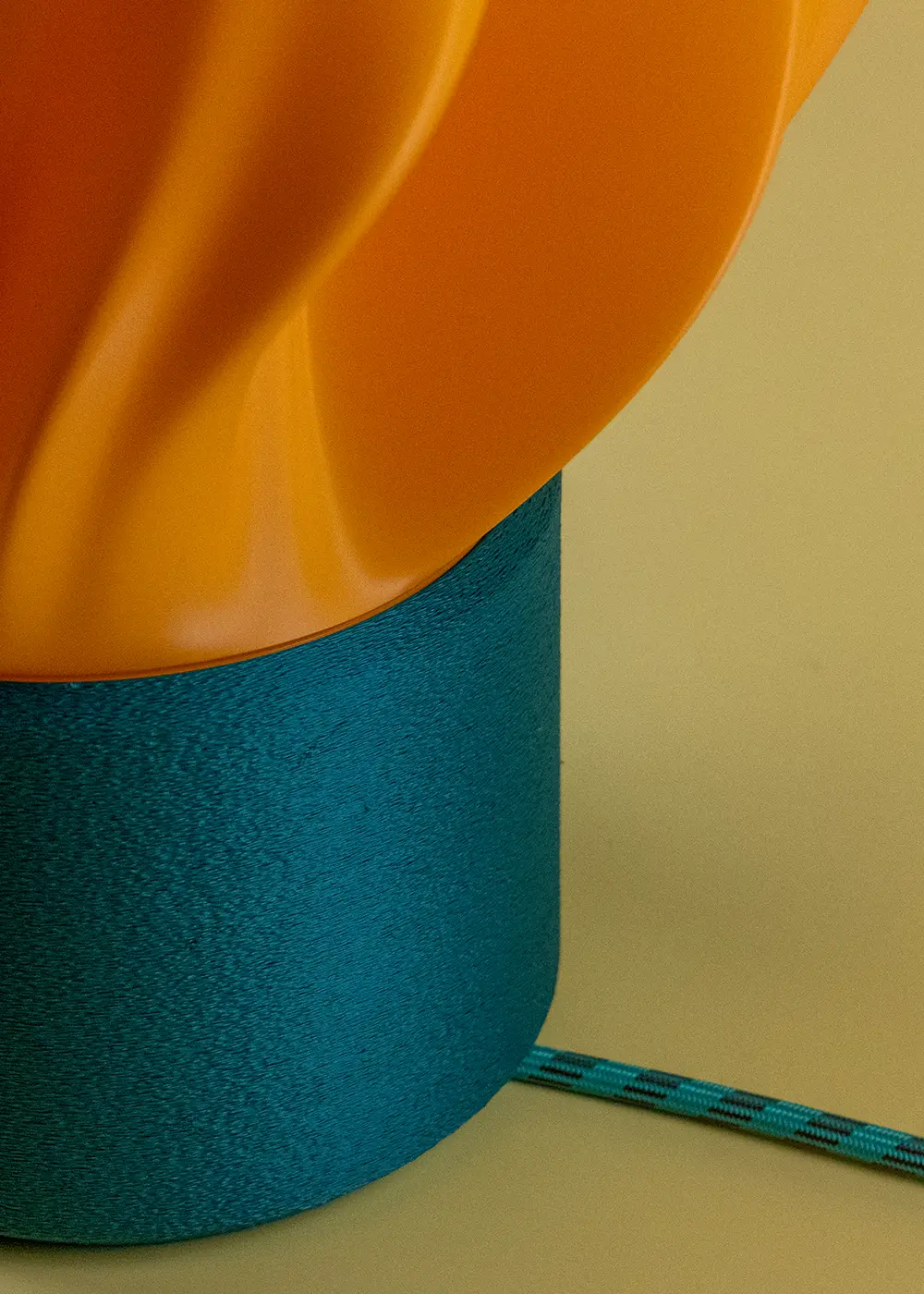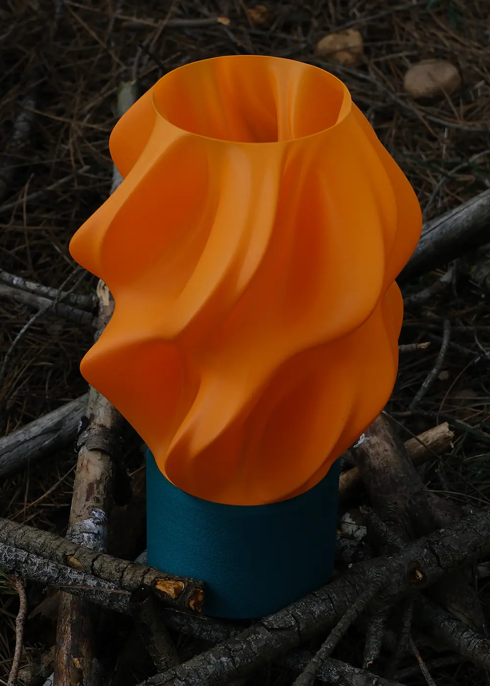 Canlı renk geçişleri ve akışkan formuyla tasarlanan Fluid Amber / Forest masa lambası, modern üretim teknolojisini doğadan ilham alan bir estetikle buluşturur. Turuncu ve yeşilin güçlü uyumu, ışığın yüzey boyunca hareket ederek mekâna sıcak ama enerjik bir atmosfer kazandırmasını sağlar.