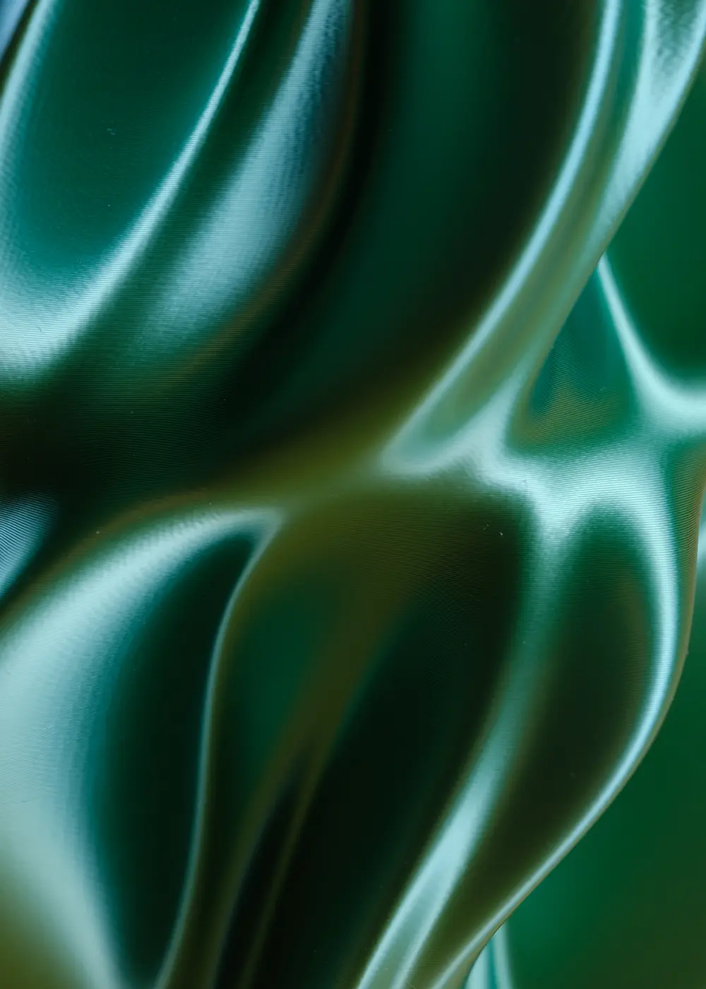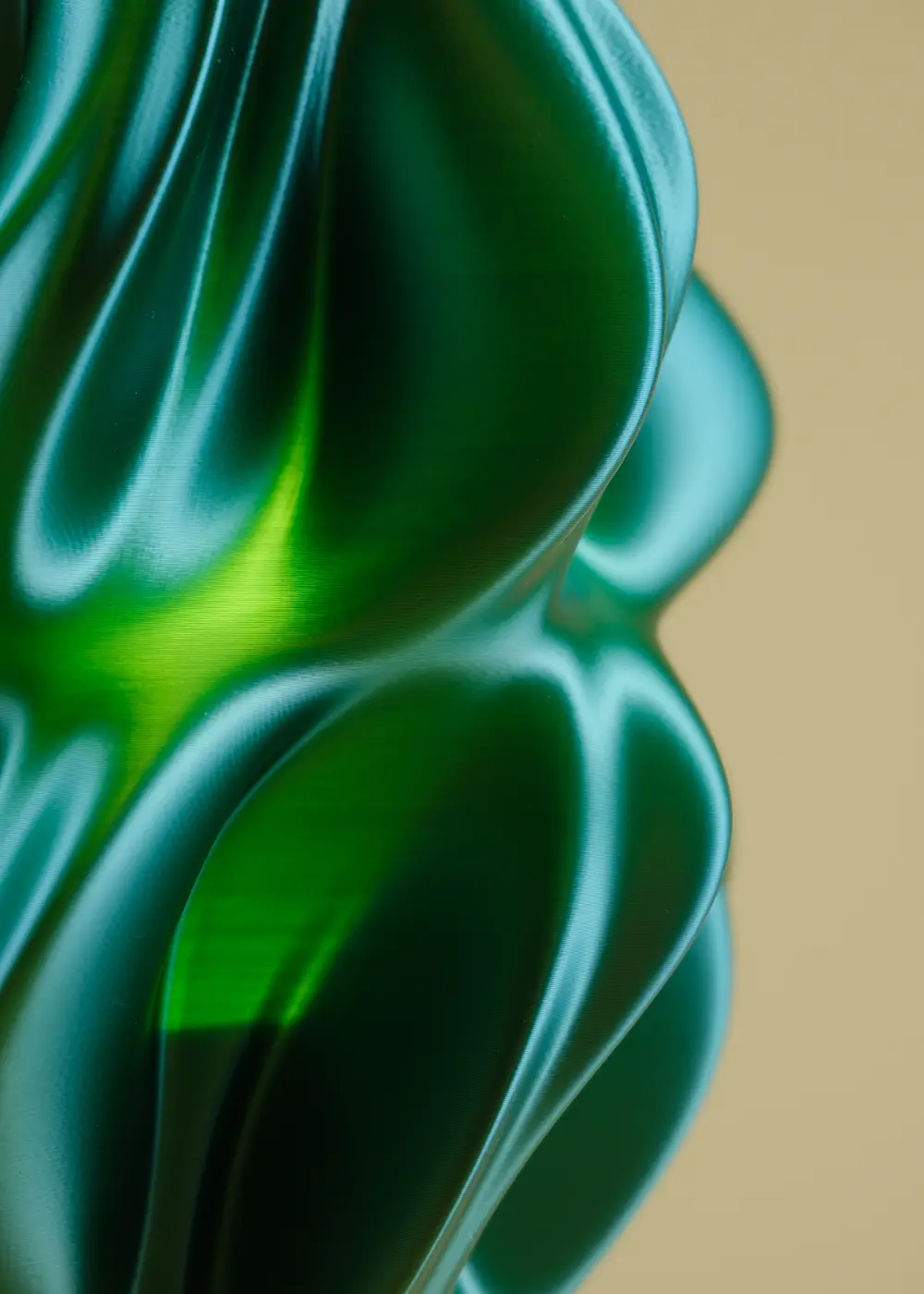Bu tasarım, 3D yazıcı teknolojisi kullanılarak bitkisel bazlı biyopolimerlerden üretilmiştir. Katmanlı üretim süreci, yüzeyde kendine özgü bir doku ve hacim algısı oluşturur; her bir kıvrım ışığı farklı şekilde yakalayarak tasarımın heykelsi niteliğini güçlendirir.