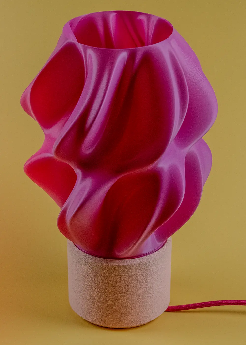 Bu tasarım, 3D yazıcı teknolojisi kullanılarak bitkisel bazlı biyopolimerlerden üretilmiştir. Katmanlı üretim süreci, yüzeyde kendine özgü bir doku ve derinlik oluşturarak ışığın her açıdan farklı algılanmasını sağlar.