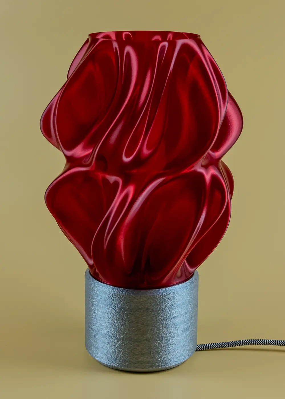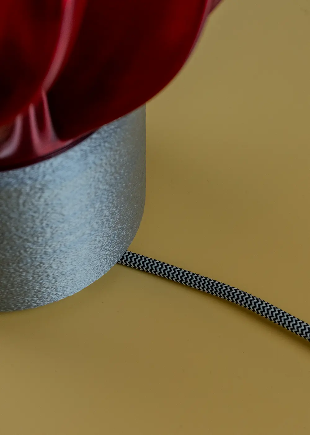 Fluid Silver / Scarlet masa lambası; salon, çalışma alanı, konsol üstü veya yaratıcı stüdyolarda güçlü bir tasarım vurgusu oluşturur. Scarlet tonun sıcaklığı mekâna enerji katarken, gri kaide modern bir denge sağlar.