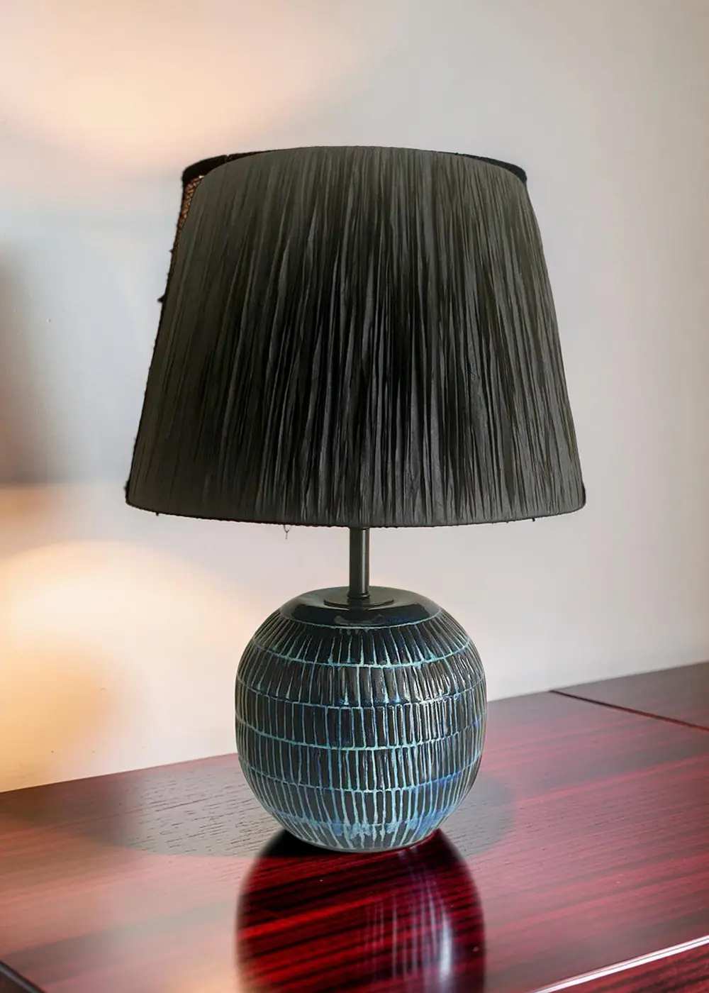 Gece ve Deniz Abajur, bulunduğu alanda tek başına güçlü bir odak noktası yaratır. Koyu tonların derinliği ile mavi yansımaların dinamizmi birleşerek mekâna katmanlı bir atmosfer kazandırır. Özellikle yan sehpa, komodin veya dresuar üzerinde kullanıldığında, bulunduğu alanı daha karakterli ve bütünlüklü hale getirir.