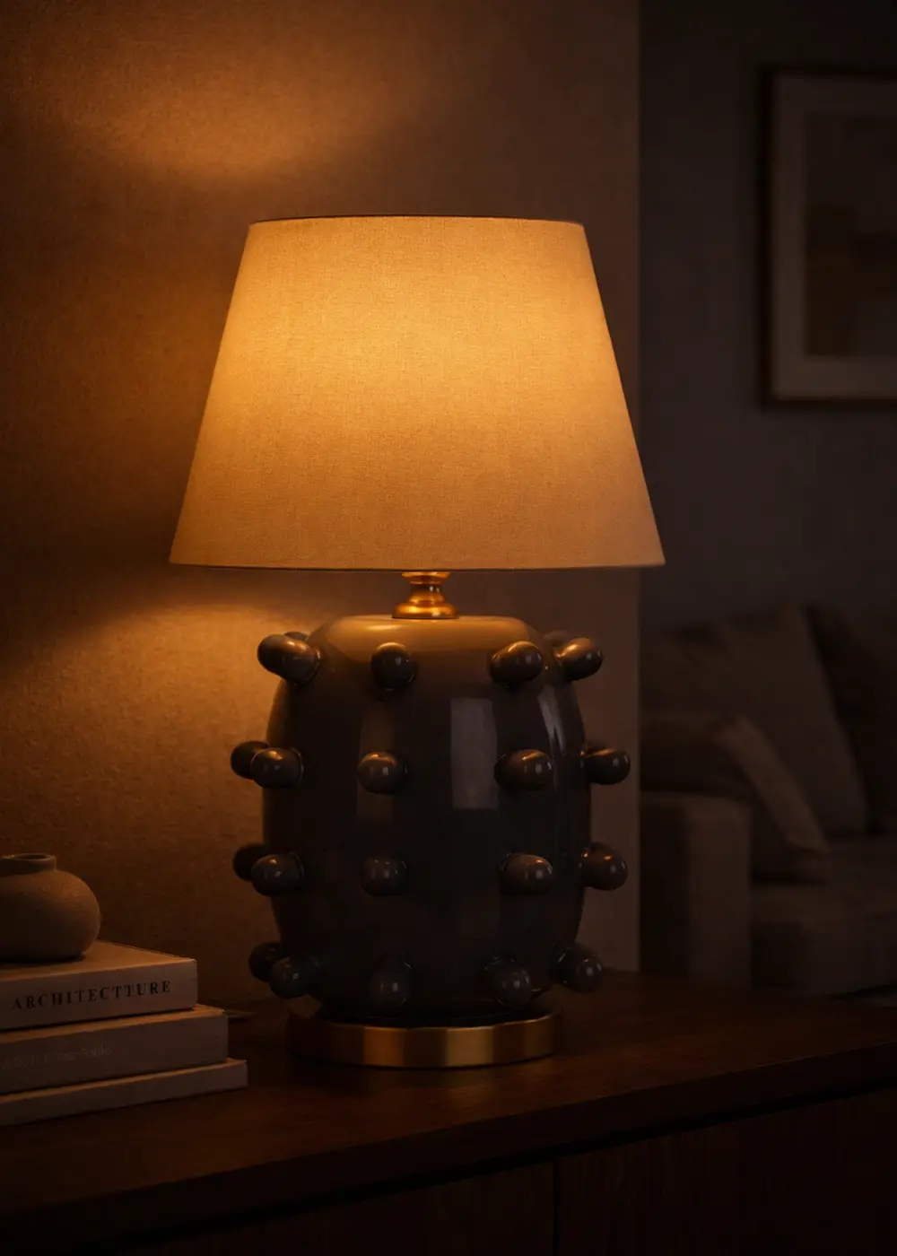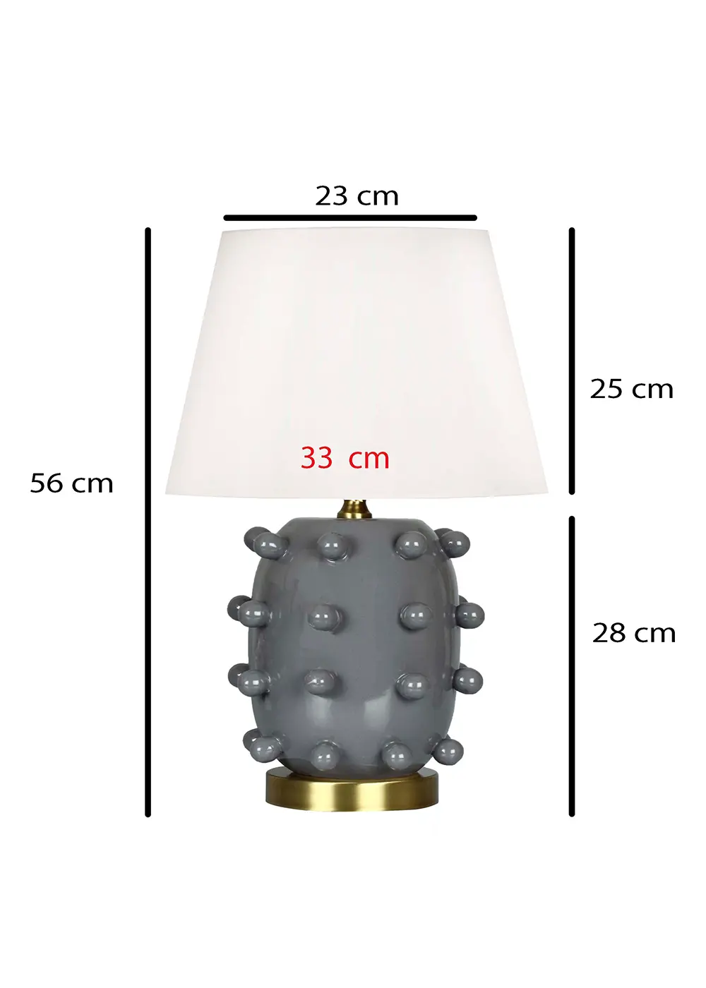 Gri Roma Seramik Abajur, parlak sırlı el yapımı seramik gövdesi ve krem kumaş şapkasıyla modern dekorasyonlara dengeli ve zarif bir dokunuş kazandırır. Yuvarlak kabartmalı yüzey detayları tasarıma heykelsi bir karakter katarken, gri tonun nötr yapısı mekâna uyumlu ve sakin bir estetik sunar.