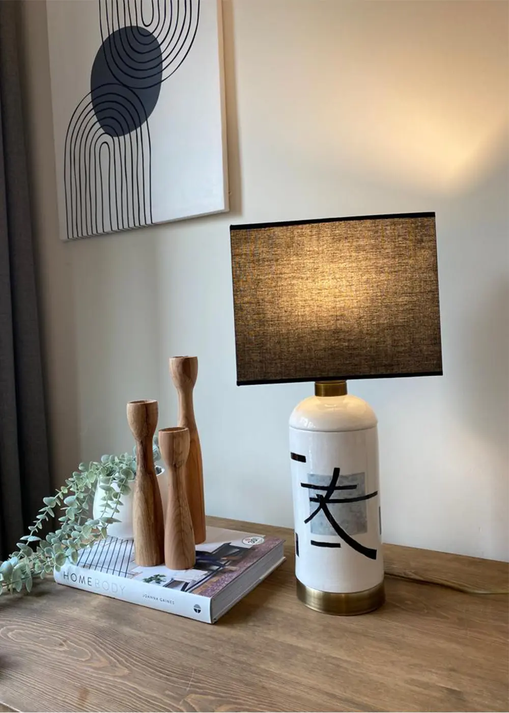 Koyu tonlardaki şapkası, ışığı yumuşatarak ortama dingin ve kontrollü bir ambiyans kazandırır. Modern, Japandi ve minimal dekorasyon anlayışına sahip yaşam alanları için güçlü ama sade bir tamamlayıcıdır.