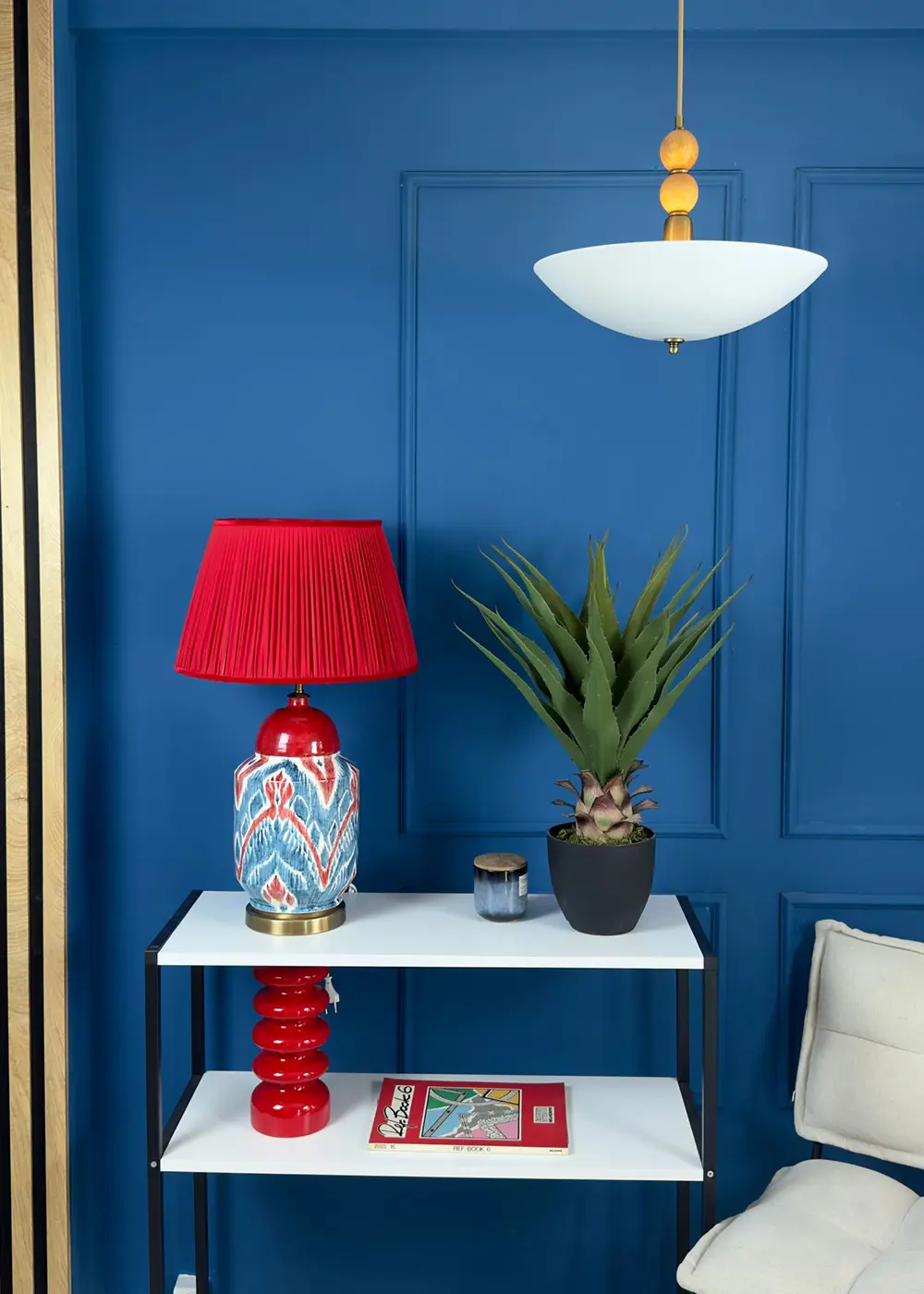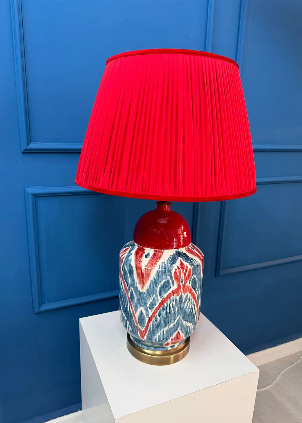 Kırmızı tonlardaki pliseli şapkası, tasarıma sofistike bir hareket katarken ışığı yumuşatarak ortama sıcak ve davetkâr bir ambiyans yayar. Klasik ile modernin dengeli birleşimi sayesinde farklı dekorasyon stillerine kolayca uyum sağlar.
