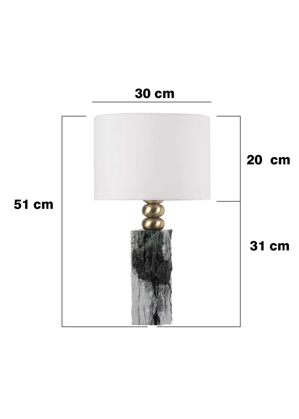 30 cm çapında ve 20 cm yüksekliğindeki krem kumaş şapka, ışığı yumuşak ve dengeli biçimde dağıtarak sıcak bir atmosfer oluşturur. Toplam 51 cm yüksekliğe sahip bu doğal mermer masa lambası; salon, yatak odası, antre ve ofis dekorasyonlarında hem aydınlatma hem de güçlü bir dekoratif obje olarak konumlanabilir.