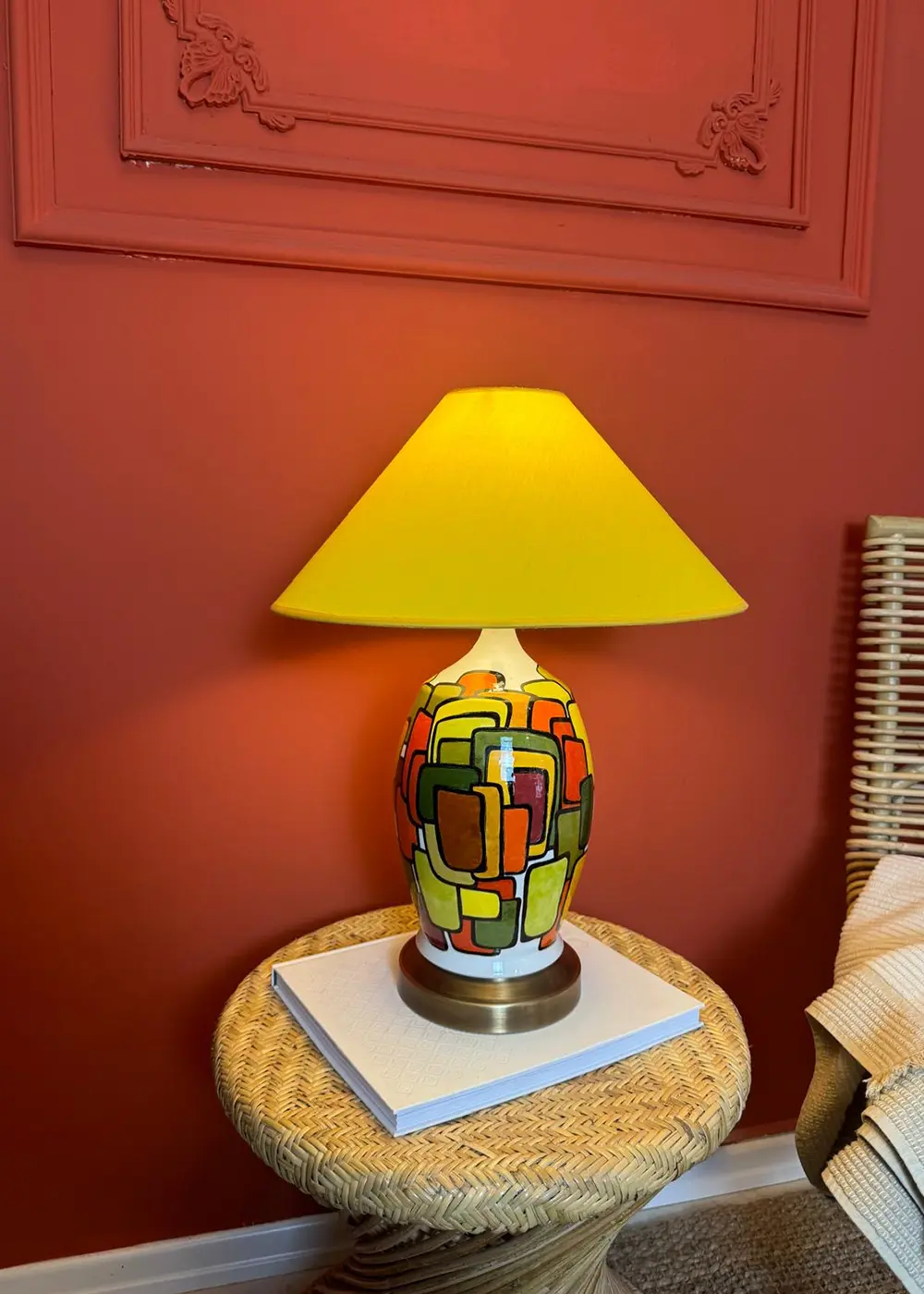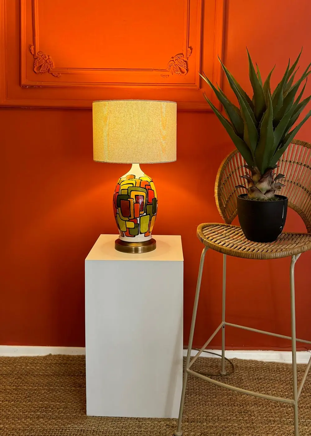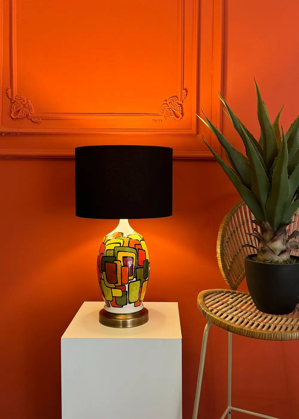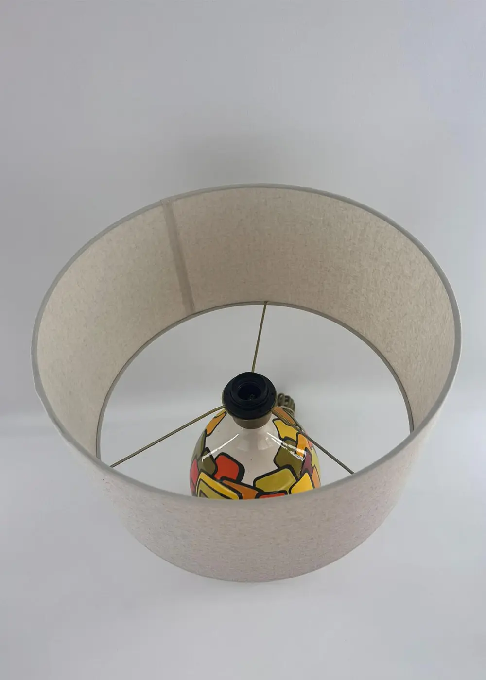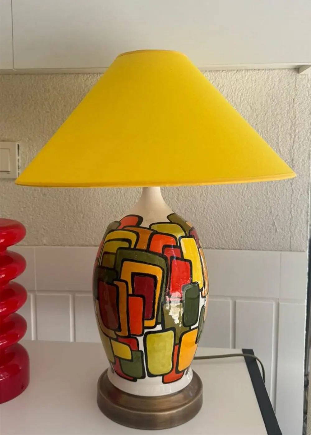 Açık tonlardaki şapkası, güçlü renk kompozisyonunu yumuşatarak ışığı dengeli bir şekilde yayar ve ortama sıcak, davetkâr bir ambiyans kazandırır. Modern, mid-century ve retro dokunuşlar barındıran dekorasyonlar için güçlü bir tamamlayıcıdır.