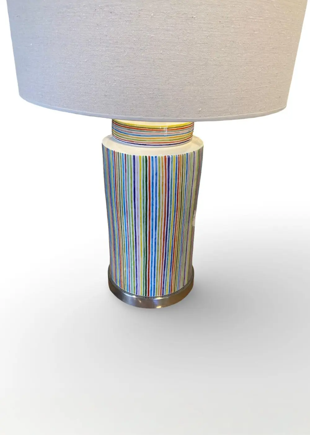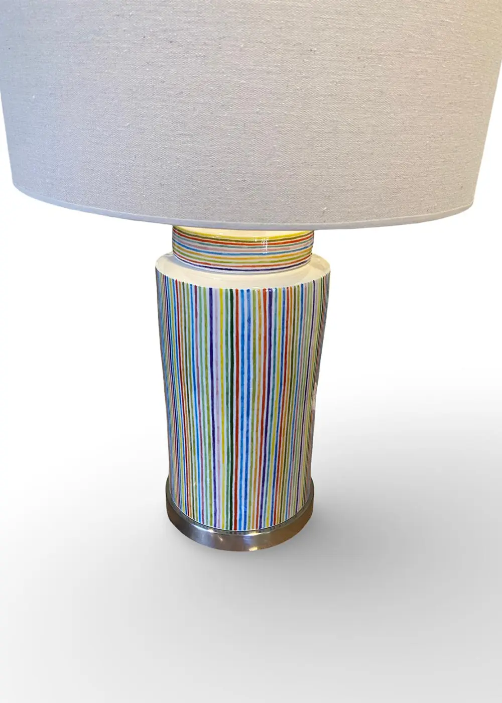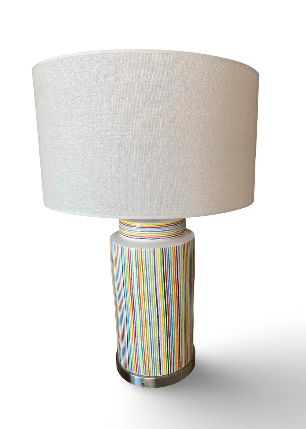 İnce detayların güçlü bir bütün oluşturduğu Lines Abajur, sade formu ve ritmik desen yapısıyla yaşam alanlarına zarif bir hareket kazandırır. El yapımı seramik gövdesi üzerindeki çok renkli çizgiler, tasarıma dinamik bir akış katarken uzaktan sade, yakından ise zengin bir görsel deneyim sunar.