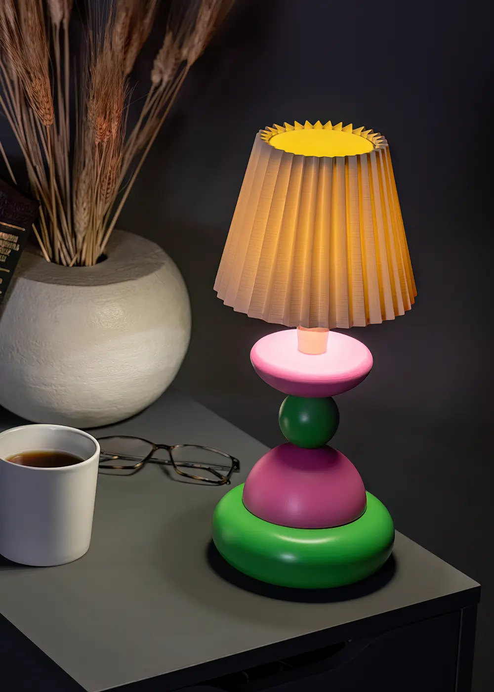 Serinin bu versiyonunda kullanılan yeşil ve pembe renk birlikteliği, tasarıma enerjik ve neşeli bir karakter kazandırırken pileli tekstil abajur şapkası ışığın ortama daha yumuşak ve dengeli yayılmasını sağlar. Pirinç detayların kattığı zarif dokunuşla birlikte Little Lollies No:10; raflarda, komodinlerde ya da çalışma masalarında modern yaşam alanlarına playful bir atmosfer kazandıran karakterli bir tasarım lamba olarak konumlanır.