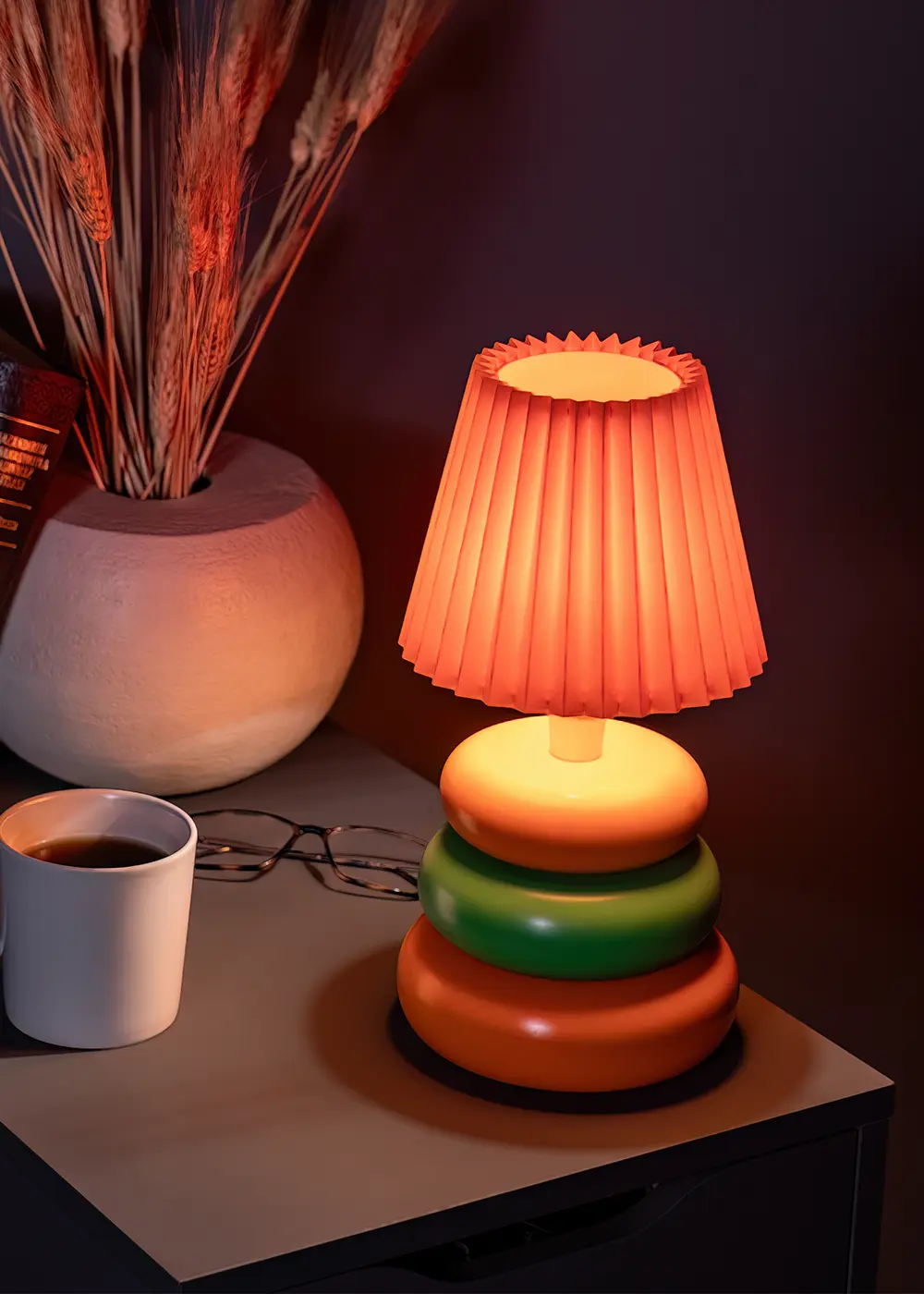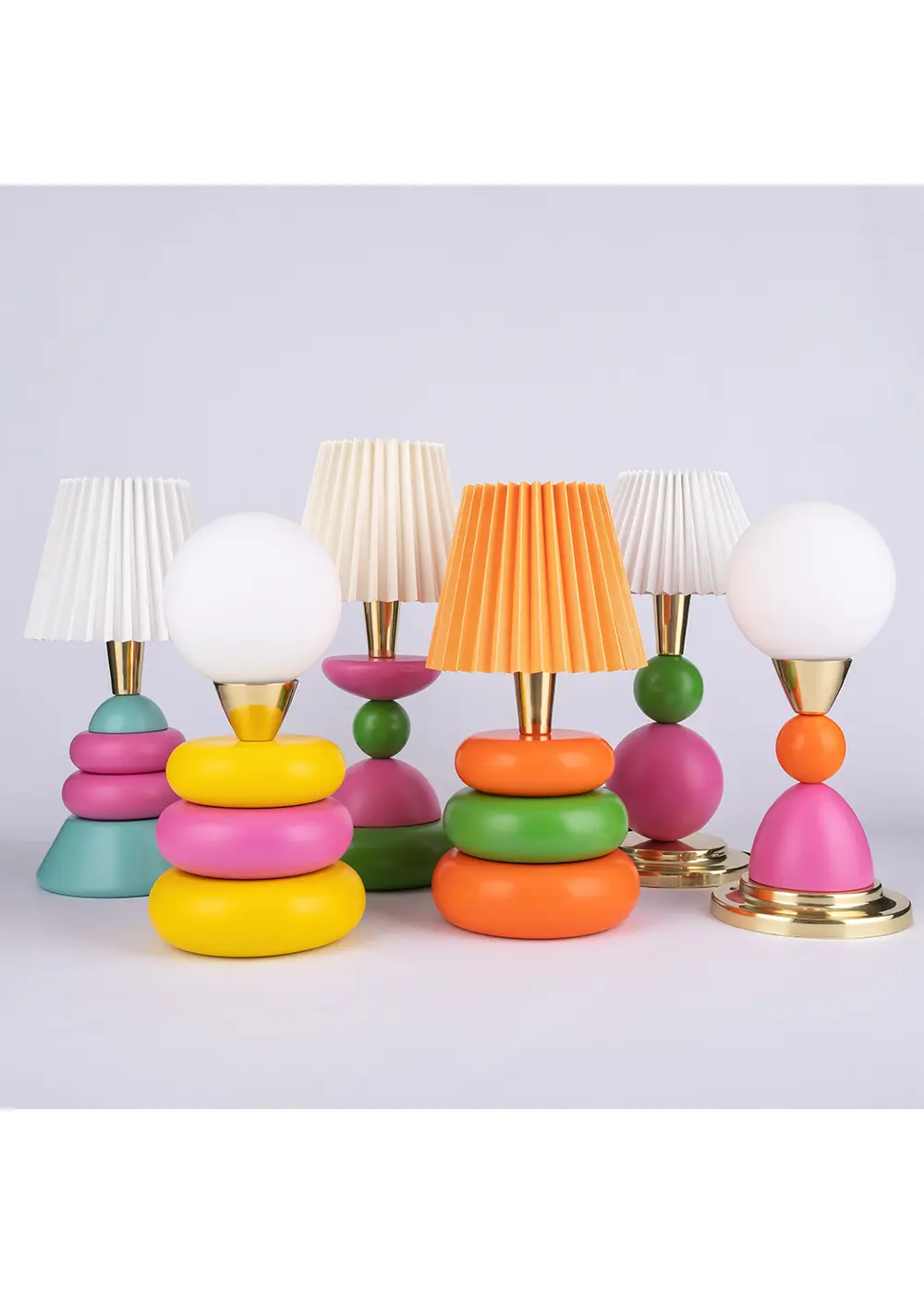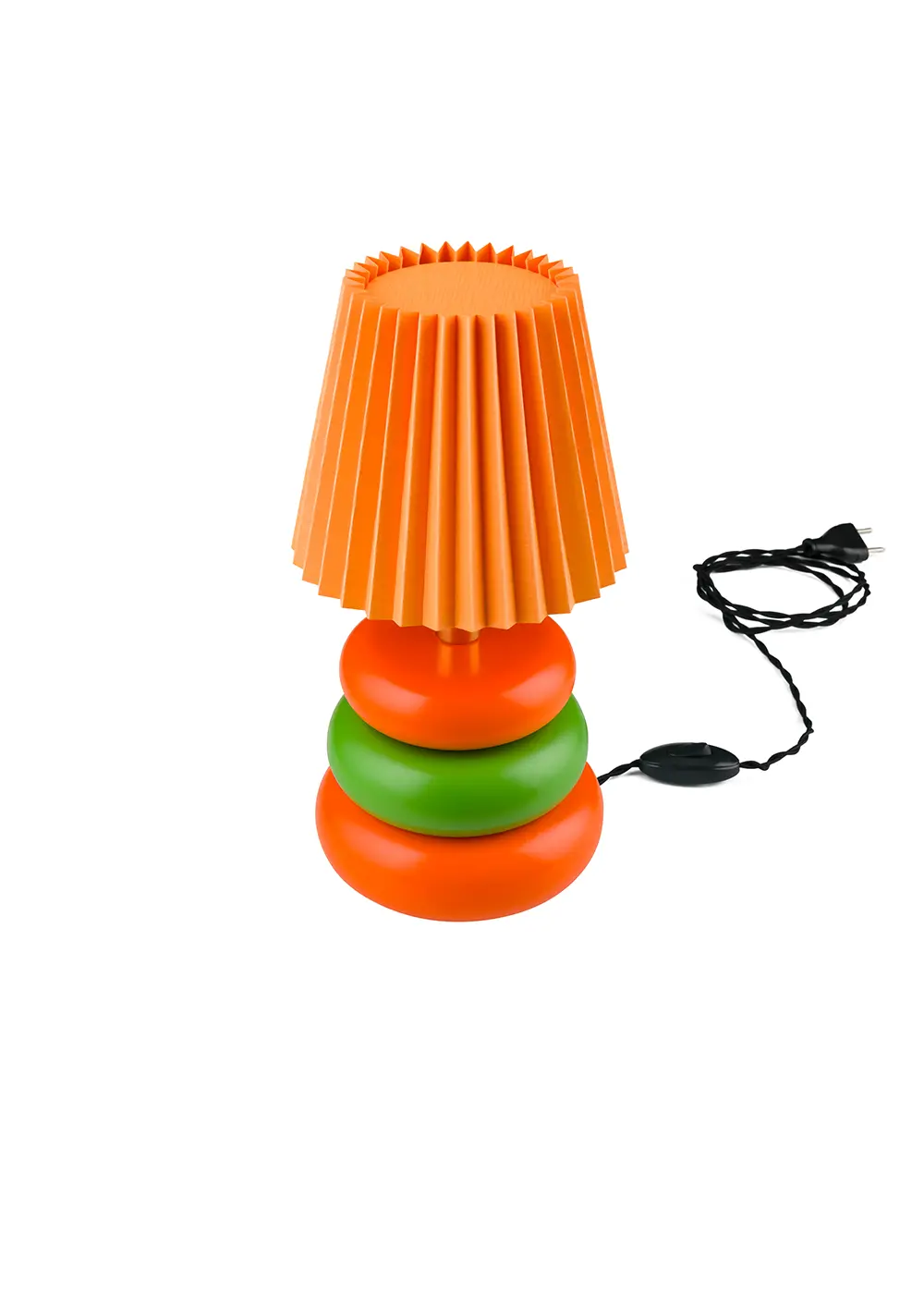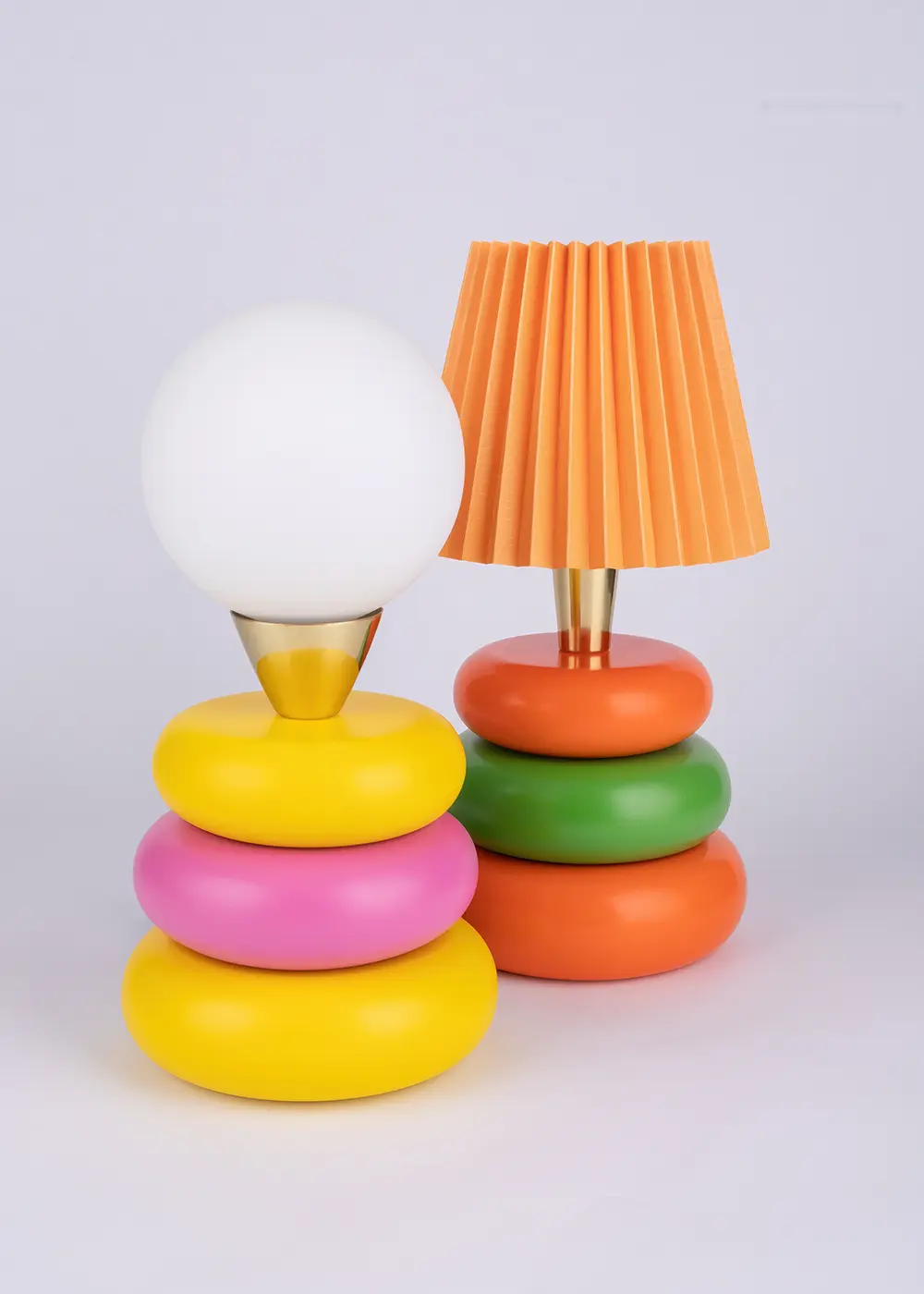 Serinin bu versiyonunda kullanılan canlı turuncu ve yeşil renk birlikteliği, tasarıma enerjik ve dinamik bir karakter kazandırırken pileli tekstil abajur şapkası ışığın ortama daha yumuşak ve dengeli yayılmasını sağlar. Pirinç detayların kattığı zarif dokunuşla birlikte Little Lollies No:8; raflarda, komodinlerde ya da çalışma masalarında modern mekânlara hareket ve karakter kazandıran playful bir tasarım lamba olarak konumlanır.