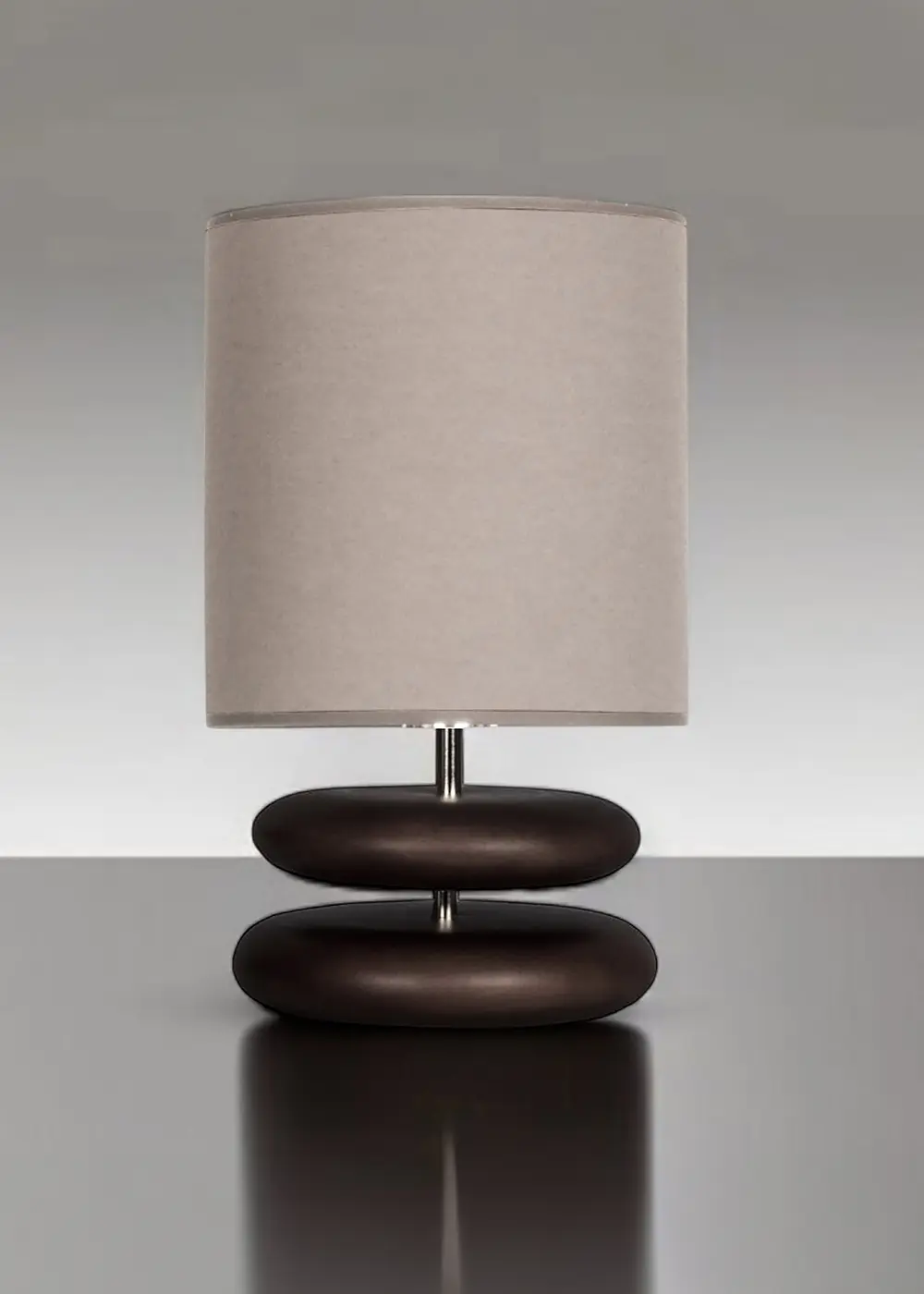 Gövde, koyu ceviz tonunda cilalanmış el yapımı ahşaptan üretilmiştir. Çift halkalı form, tasarıma heykelsi bir denge kazandırırken mat yüzey dokusu doğal malzeme hissini ön plana çıkarır.