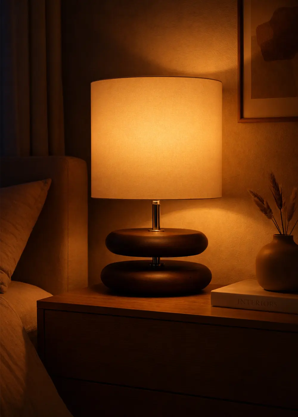 Krem renkli kumaş şapka, ışığın homojen şekilde dağılmasını sağlayarak daha aydınlık ve dengeli bir ambiyans oluşturur. Parlak krom kaplama metal detay, koyu ahşap ile modern bir kontrast yaratır.