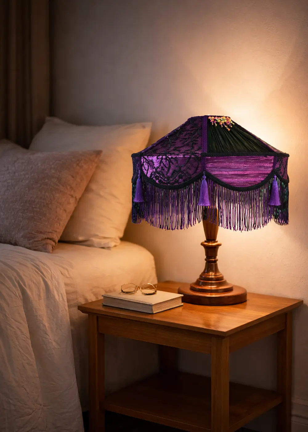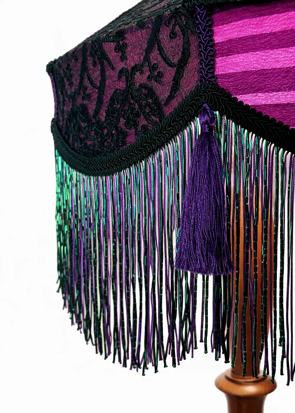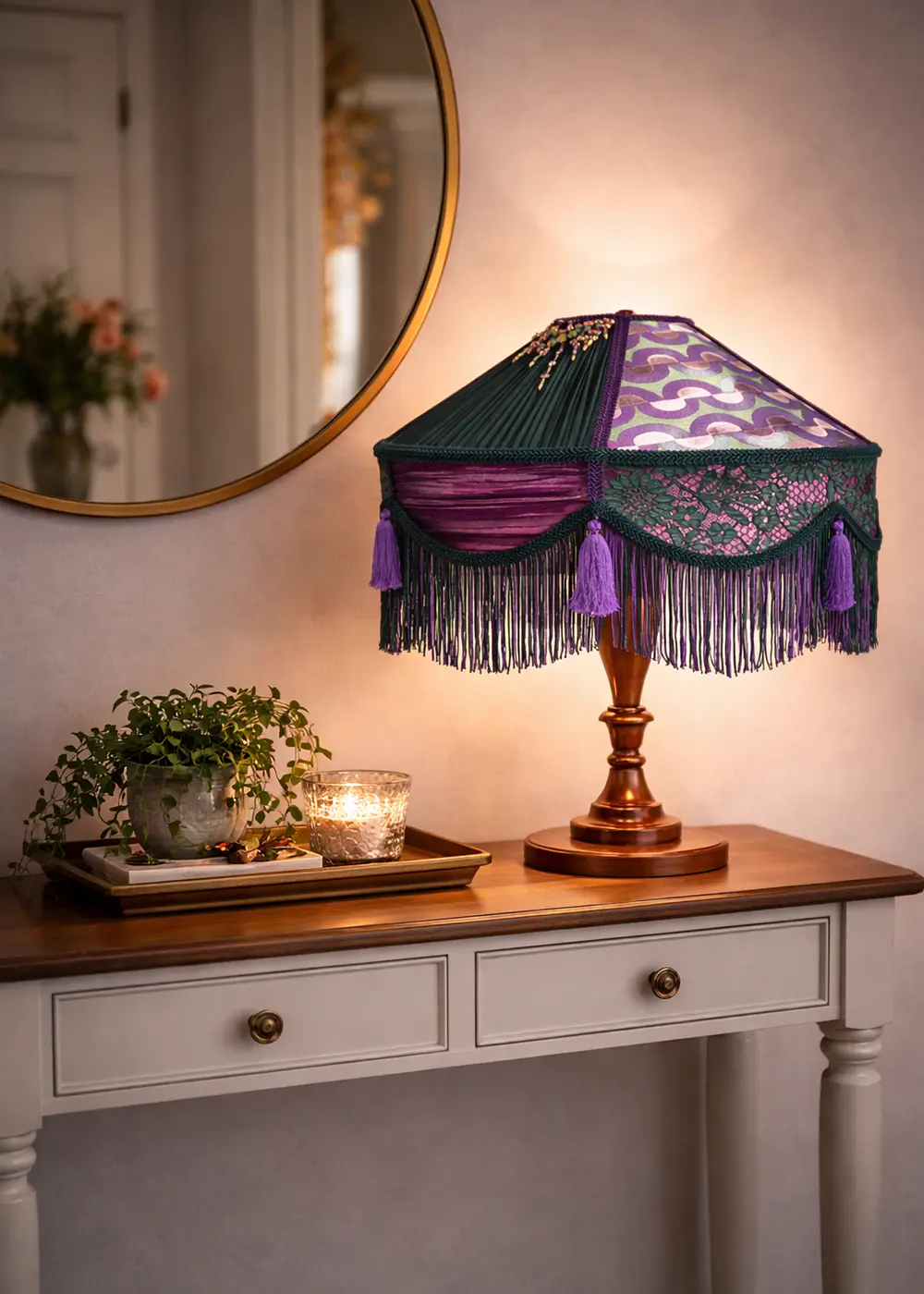 Saçak ve dantel dokular Victorian/Edwardian bir zarafet taşırken, desenli saten panel Art Deco/retro bir ritim yaratır. Fuşya–mor–yeşil kontrastı ise modern maksimalist bir imzaya dönüşür. Salon, çalışma odası, konsol/sehpa üstü kullanım için güçlü bir “statement” parça.