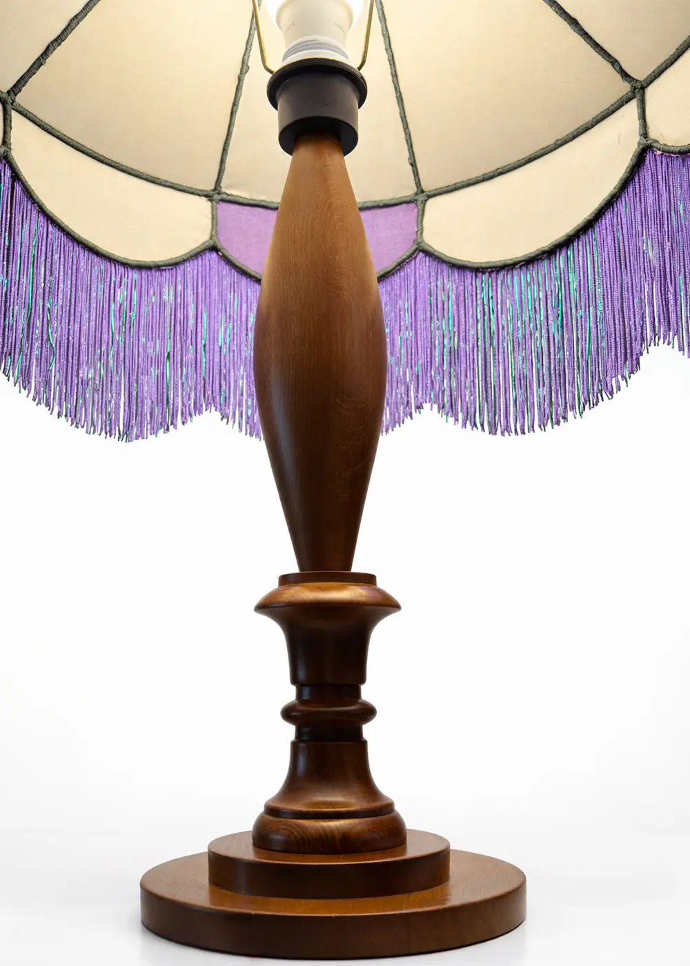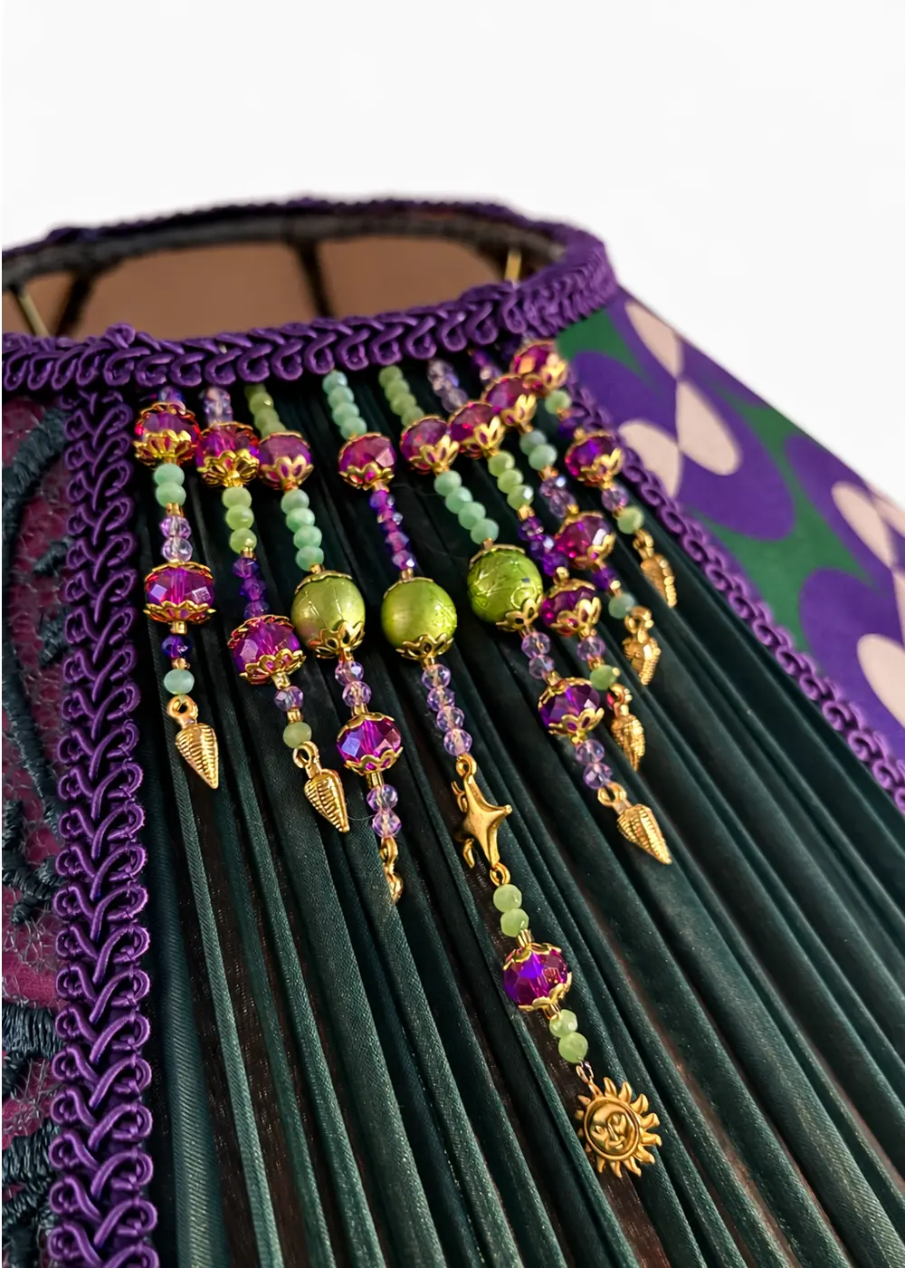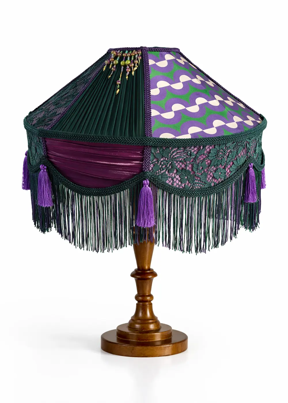 Saçak ve dantel dokular Victorian/Edwardian bir zarafet taşırken, desenli saten panel Art Deco/retro bir ritim yaratır. Fuşya–mor–yeşil kontrastı ise modern maksimalist bir imzaya dönüşür. Salon, çalışma odası, konsol/sehpa üstü kullanım için güçlü bir “statement” parça.