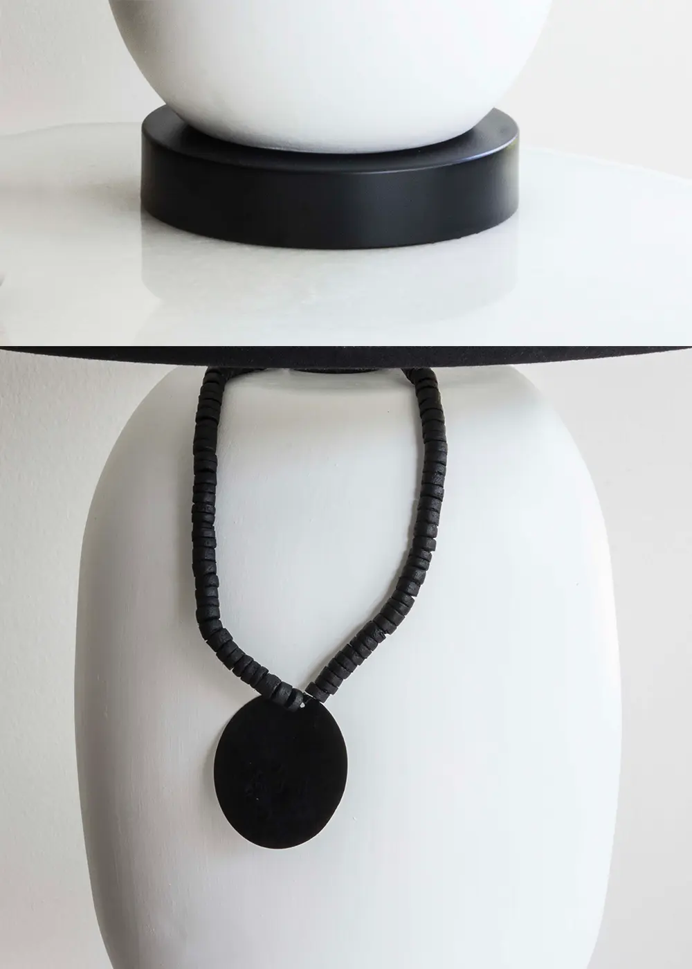 Üzerindeki lava taş kolye detayı, bu aydınlatma ürününü yalnızca işlevsel bir obje olmaktan çıkarır; mekâna kültürel ve heykelsi bir kimlik kazandırır.