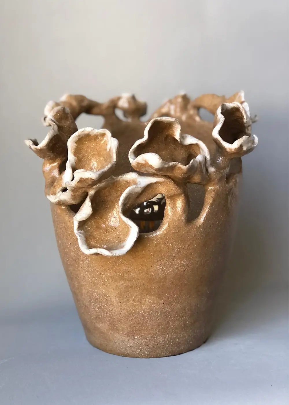 Toprak tonlarının sıcaklığı ve elde şekillendirilmiş yüzey dokusu sayesinde her açıdan farklı bir karakter sergiler. Işıkla buluştuğunda, yüzeyde oluşan gölgeler ve boşluklardan süzülen ışık mekâna derinlik ve yumuşaklık katar.