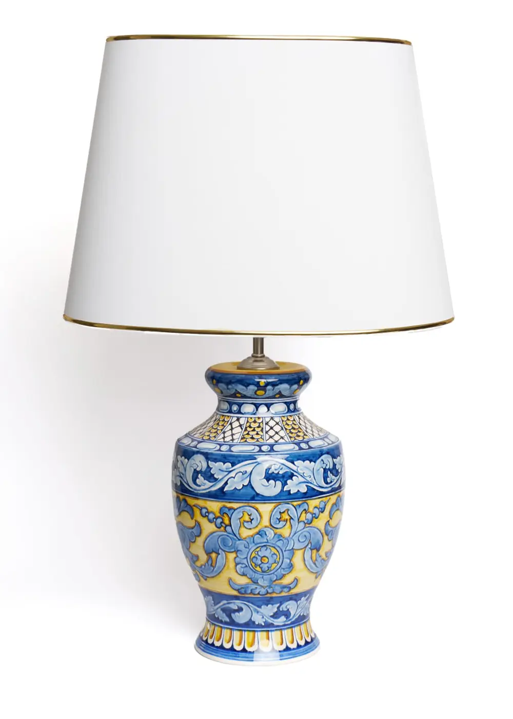 Bu abajurun gövdesi tamamen el yapımı seramik olup, üzerindeki motifler tek tek elde boyanmıştır. Seri baskı ya da transfer teknikleri kullanılmaz. Desen katmanları, renk geçişleri ve ince çizgiler usta zanaatkârların atölye üretim sürecinde sabırla uygulanır.