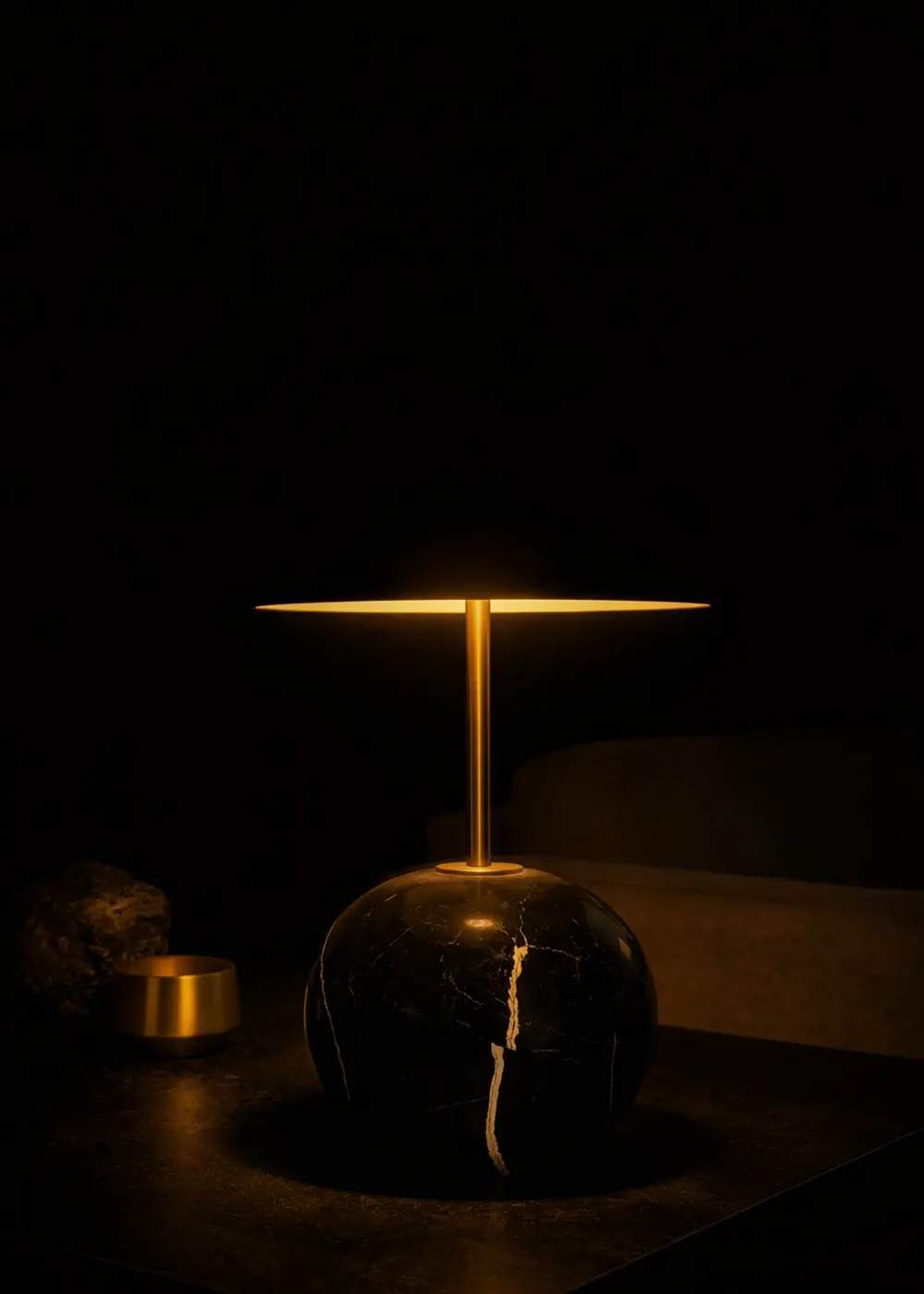 Point mermer görünümlü siyah abajur – siyah şapkalı model; güçlü kontrastı, altın detaylı modern geçişi ve heykelsi formuyla yaşam alanlarına sofistike ve prestijli bir aydınlatma çözümü sunar.