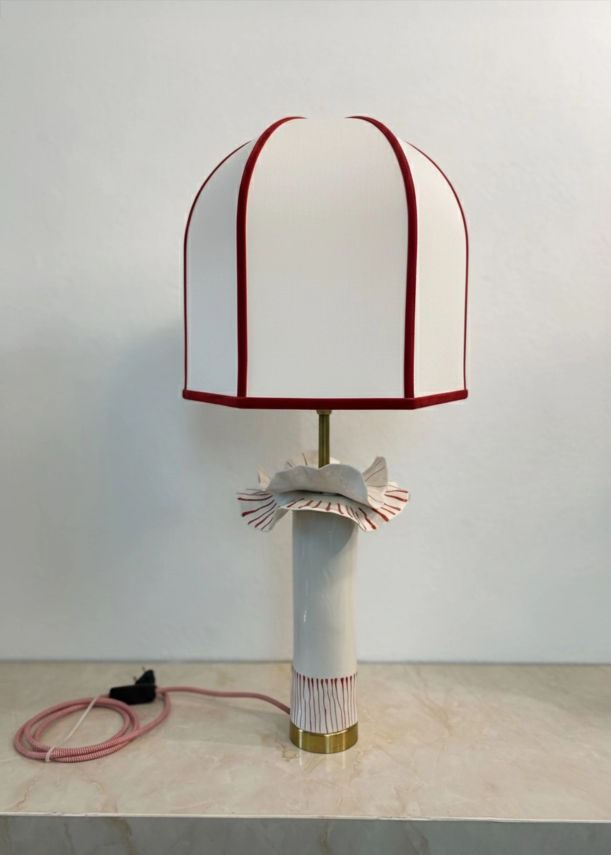 Modern çizgiler ve el emeğinin verdiği benzersiz doku ile tasarlanan Rouge Abajur, bulunduğu her ortamı yumuşacık bir ışıkla sarar.