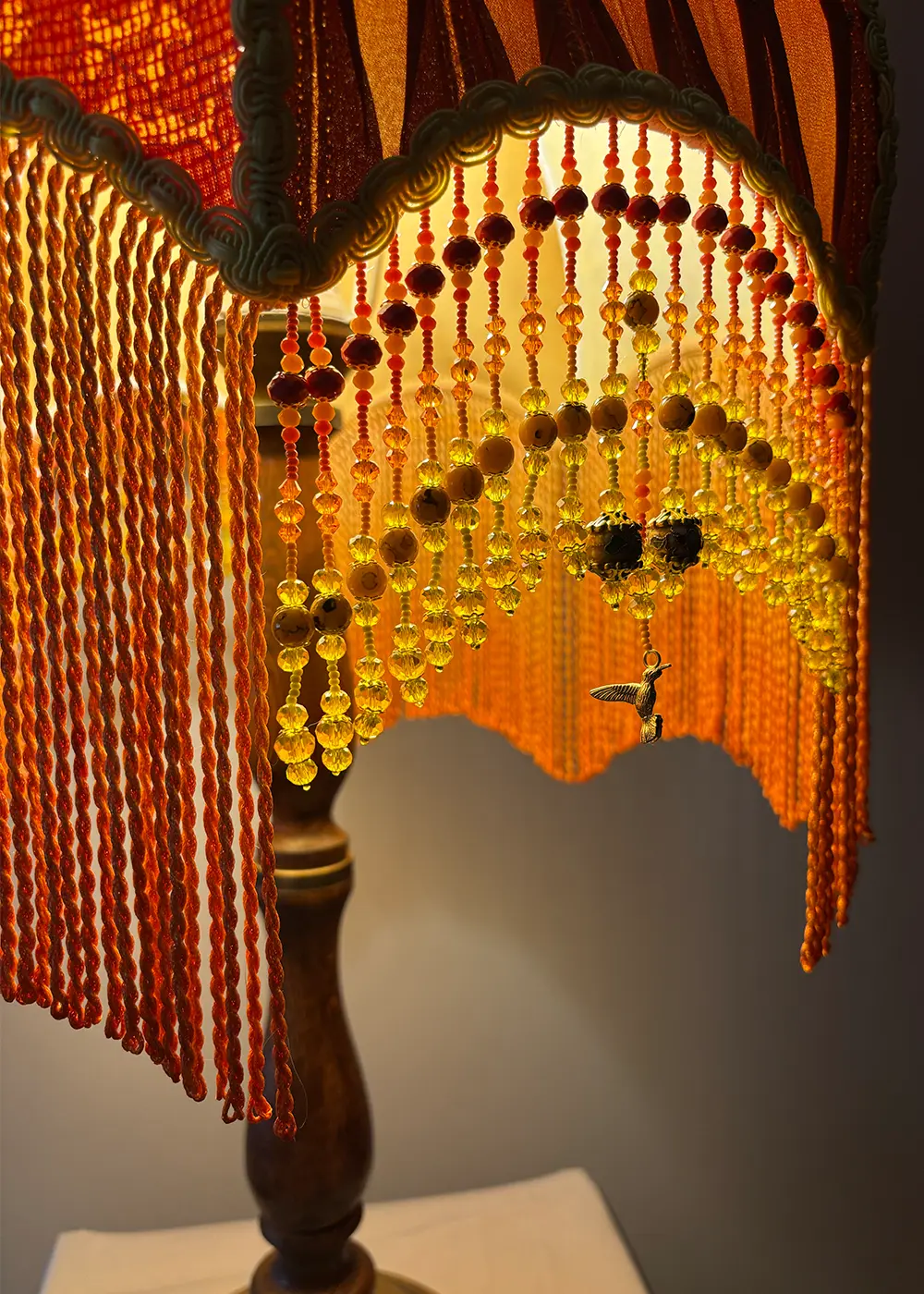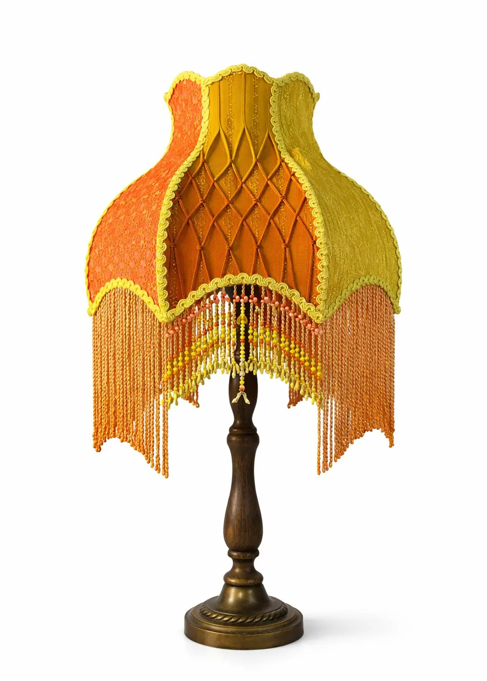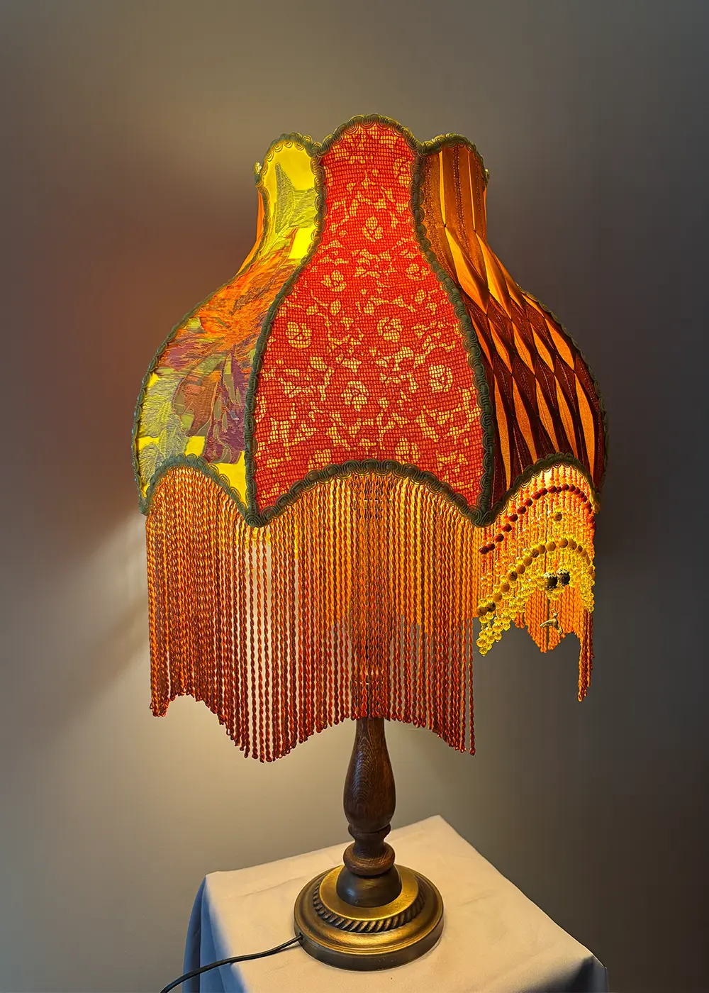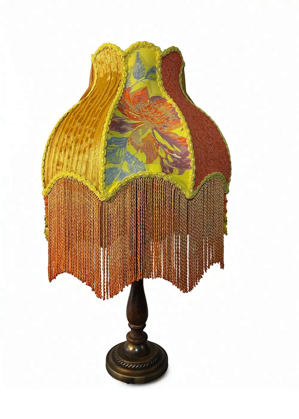 Abajurun ayağı, tornada çekilmiş mat vernikli koyu ahşap ve antik metal kombinasyonu ile hazırlanmıştır. Bu yapı, tasarımın tekstil zenginliğini dengelerken parçaya klasik, güçlü ve seçkin bir duruş kazandırır.