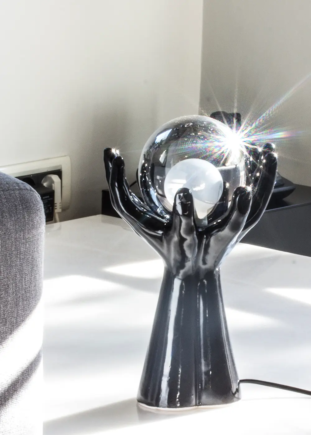 İki elin avuçlarında yükselen küre; hem dünyayı hem de ışığı simgeler. Bu metaforik tasarım, ürünü sıradan bir masa lambası olmaktan çıkarır ve çağdaş iç mekân tasarımının merkezine yerleştirir.