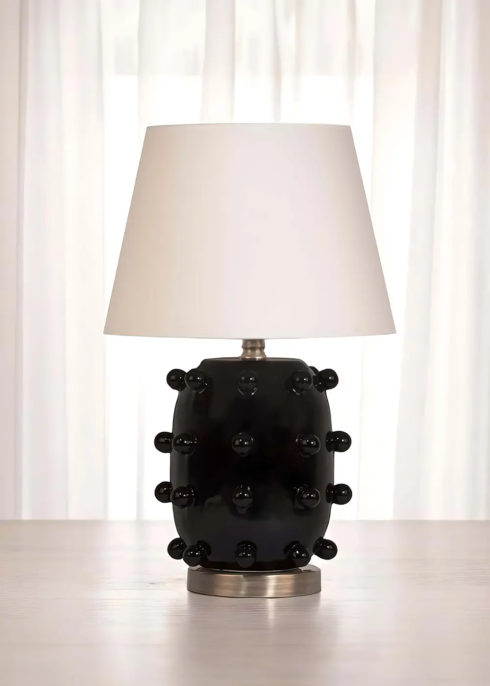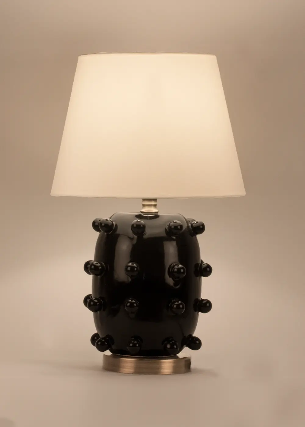 Siyah Roma Seramik Abajur, parlak sırlı el yapımı seramik gövdesi ve krem kumaş şapkasıyla güçlü bir formu zarif bir ışıkla dengeler. Kabartmalı yüzey detayları ve yuvarlak çıkıntılı formu, tasarıma heykelsi bir karakter kazandırırken, siyah yüzey ışıkla birlikte derinlik ve kontrast oluşturur.