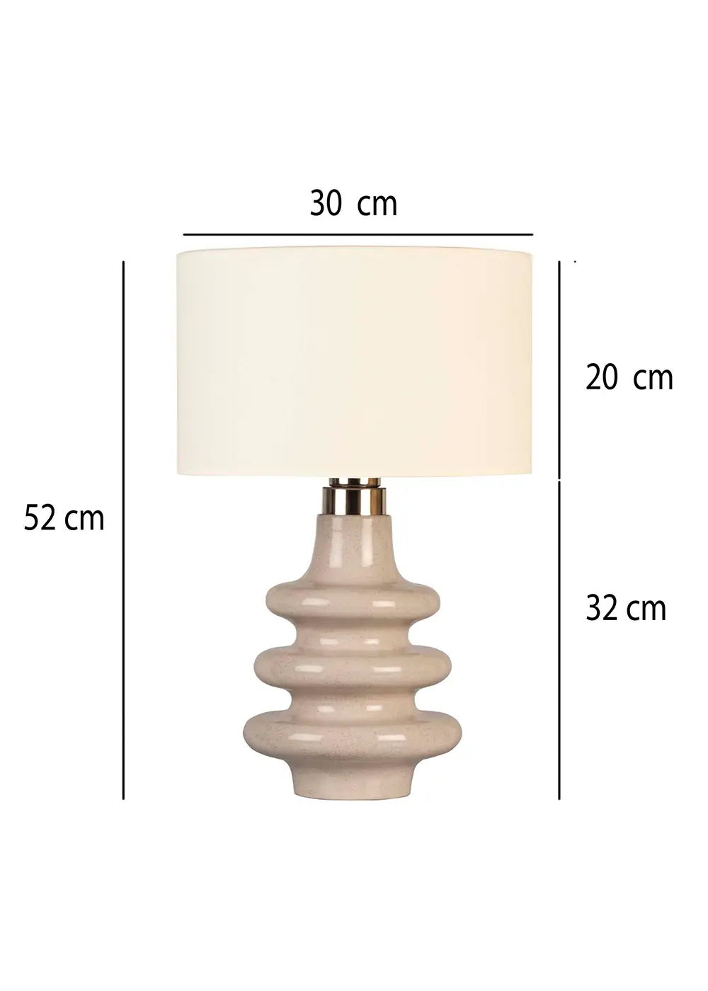 Krem tonundaki sırlı seramik yüzey, mekâna doğal bir yumuşaklık katarken; uyumlu krem kumaş şapka ışığı filtreleyerek göz yormayan, dengeli ve sıcak bir aydınlatma sunar. 52 cm toplam yüksekliği ve ideal oranları sayesinde hem dekoratif hem fonksiyonel bir masa lambası olarak rahatlıkla kullanılabilir.