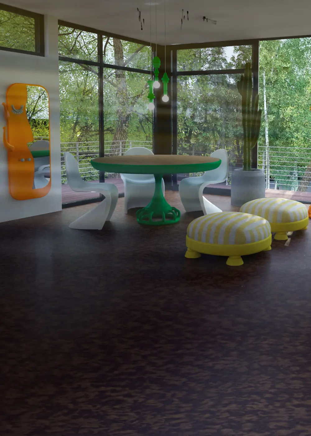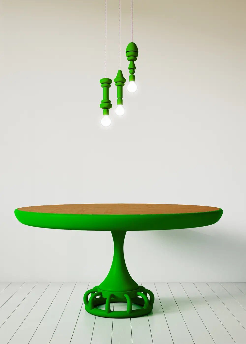 Canlı yeşil tonunun enerjik etkisi ve ahşap formun organik karakteri birleşerek, modern iç mekânlara hem çağdaş hem de yaratıcı bir atmosfer katar.